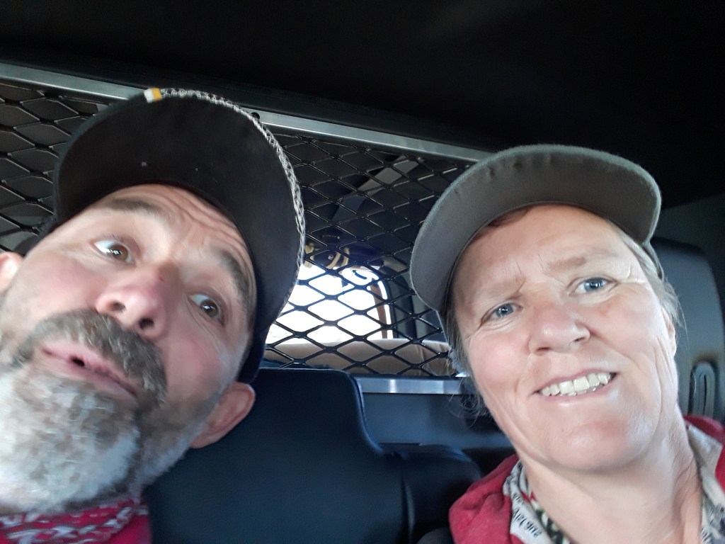 Bei der Strasse zum Campground steht ein Polizist mit seinem schwarzen fetten Fahrzeug auf dem Parkplatz. Er fragt uns, ob wir nach vorne ins Restaurant oder auf die Post müssen. Der Polizist war an Freundlichkeit nicht zu übertreffen. Die Rucksäcke deponieren wir beim Camping-Empfang und lassen uns gerne zum Essen fahren. Als wir auf dem Rücksitz sitzen, fragen wir ihn, ob wir ein Foto machen dürfen. Natürlich dürften wir. Also, schnell ein Selfie machen, das werden wir nach Hause schicken, wird sicher für Diskussionen sorgen.