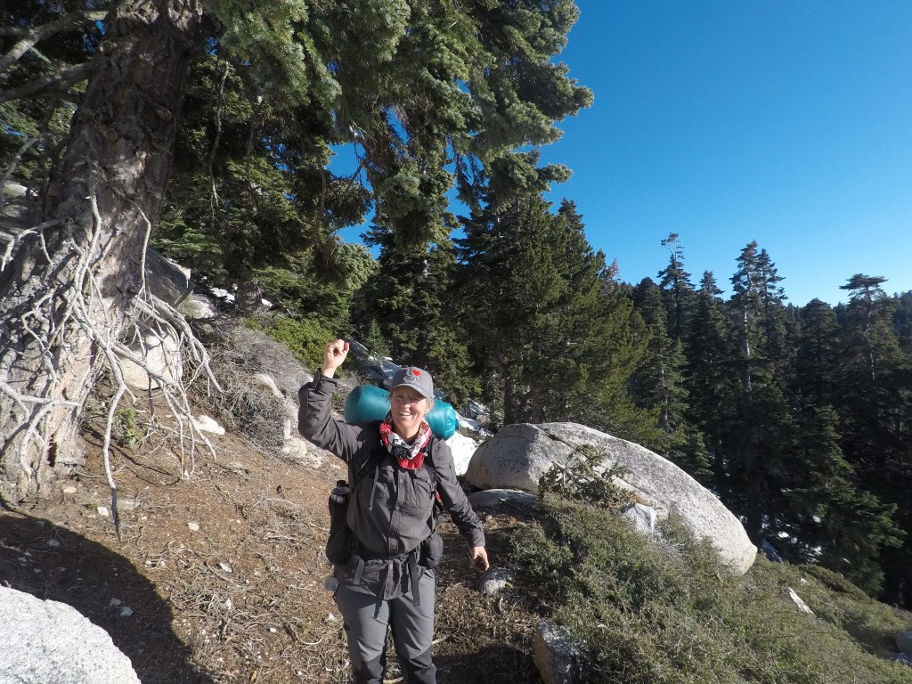 Wieder stehen wir um 5 Uhr auf und frühstücken zuerst. Wir überholen in der Frühe die anderen Hiker, die noch am Schlafen sind. Nach einer Weile den Hang hinunter, können wir erkennen, wo der Weg über die Fläche zum nächsten Tal führt. Von hier aus können wir die Autos sehen, die im Tal unterwegs sind, sie wirken extrem klein. Doch der Trail schlängelt sich unendlich im Hang hin und her und wir verlieren nur sehr langsam an Höhe.