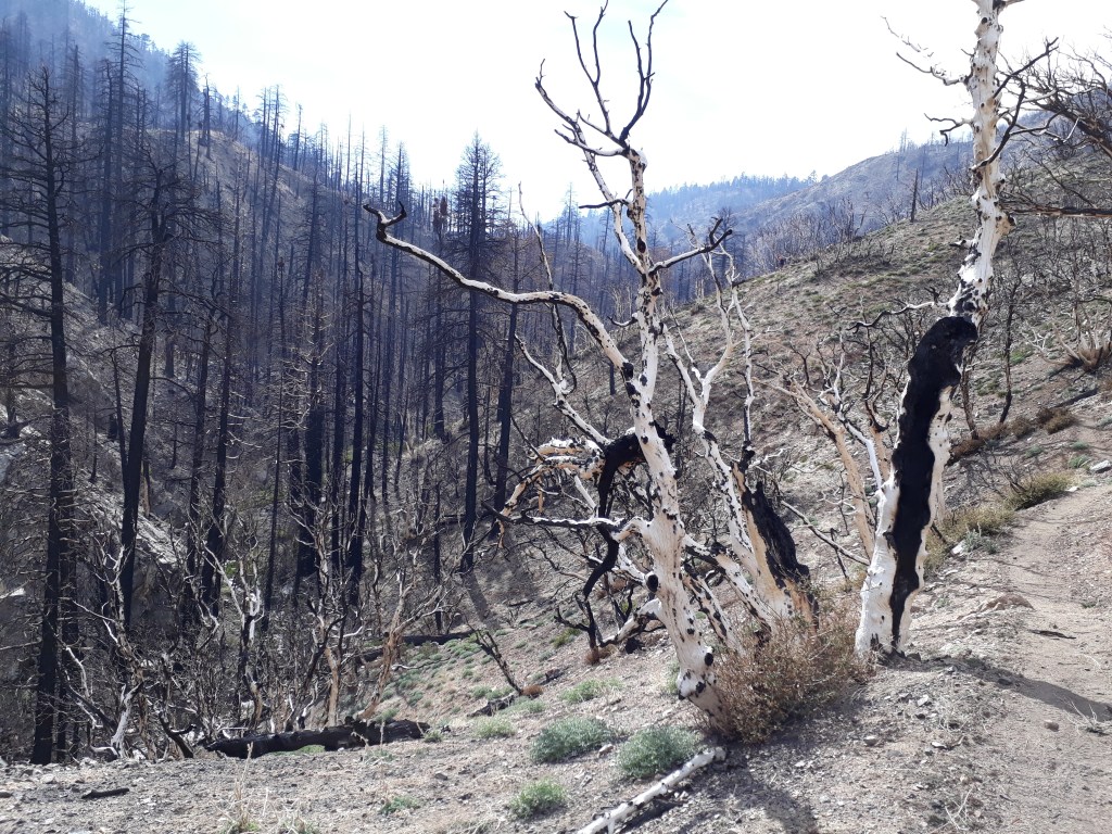 Dann gingen wir noch weiter bis wir durch ein Waldbrandgebiet kamen, der San Bernardino-Nationalpark sah nicht schön aus. Im Tal unten ist es recht feucht und es hat stehendes Wasser auf dem Waldboden, also schnell da noch etwas kochen und essen. Hier können wir auch zelten, denn zwischen den Bäumen hat es genug Platz.