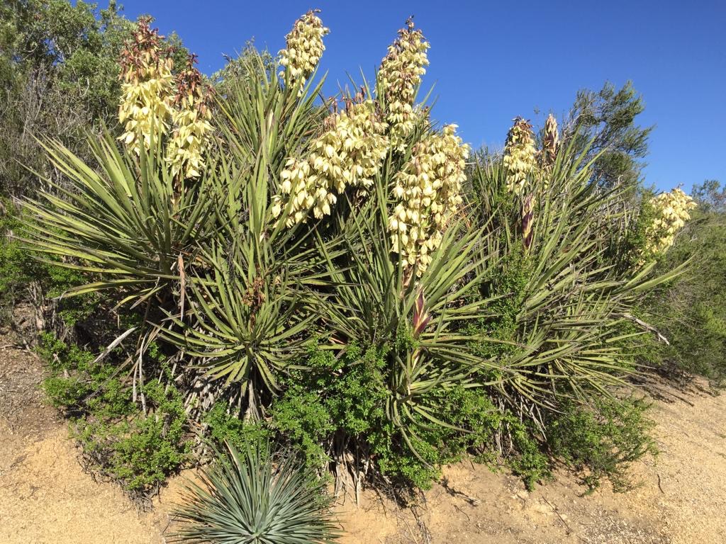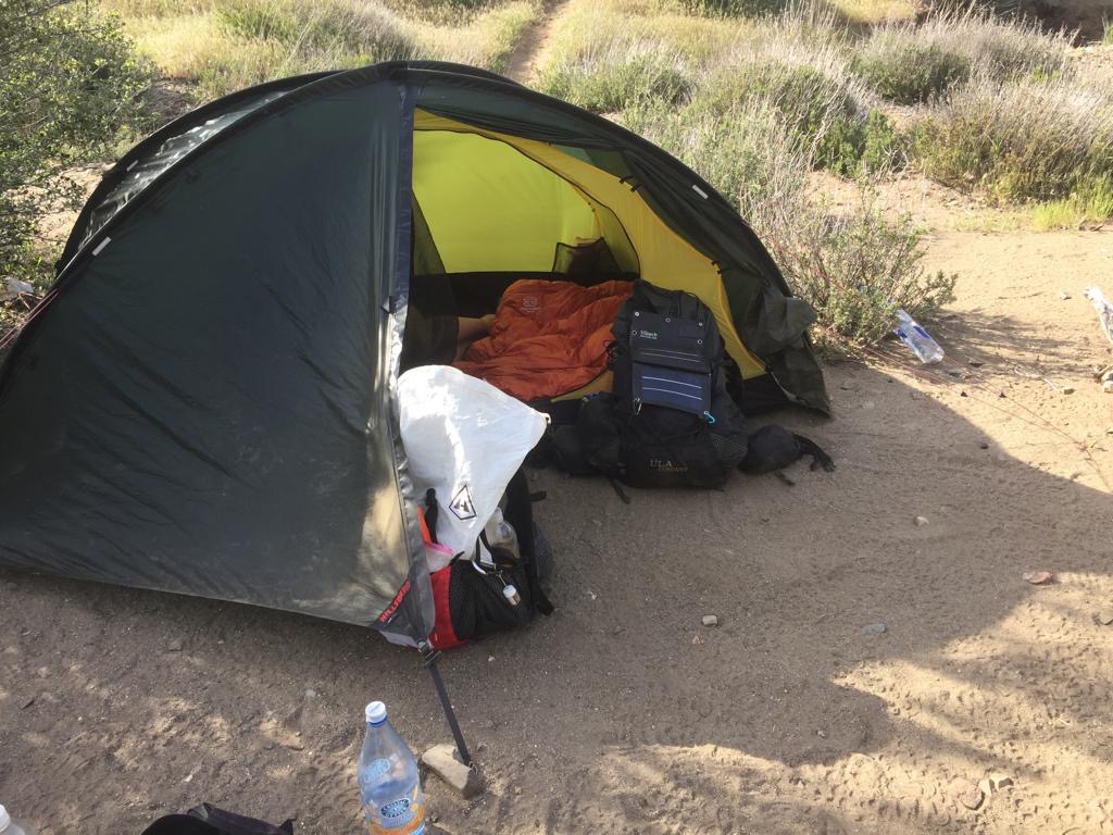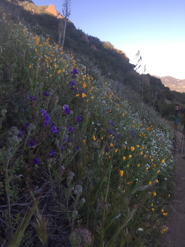 Ich habe für mich beschlossen, Andy vorne gehen zu lassen. Wir gehen im Hang nach hinten, unten im Tal fliesst eine kleiner Fluss, der Kitchen Creek. Dort machen Hiker Feierabend. Sie rufen uns zu, wir sollen auch hier zum campen kommen. Wir rufen zurück, dass wir noch in den Abend laufen. Also wünschen wir uns gegenseitig eine gute Nacht. Der Weg ist so schön mit all diesen Blumen, man könnte meinen, wir seien in den Schweiz Alpen im Frühjahr unterwegs. Wir finden einen super Platz zum übernachten, Schluss ist bei km 49,38 mit super Aussicht, und essen eine riesige Portion Haferflocken mit Erdnussbutter, lecker. Wir kämpfen um unser Gewicht, die angefutterten Kilos geben wir nicht so schnell wieder ab!