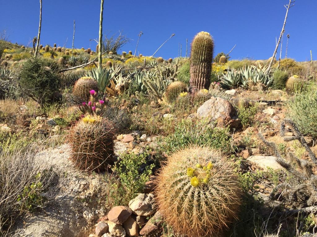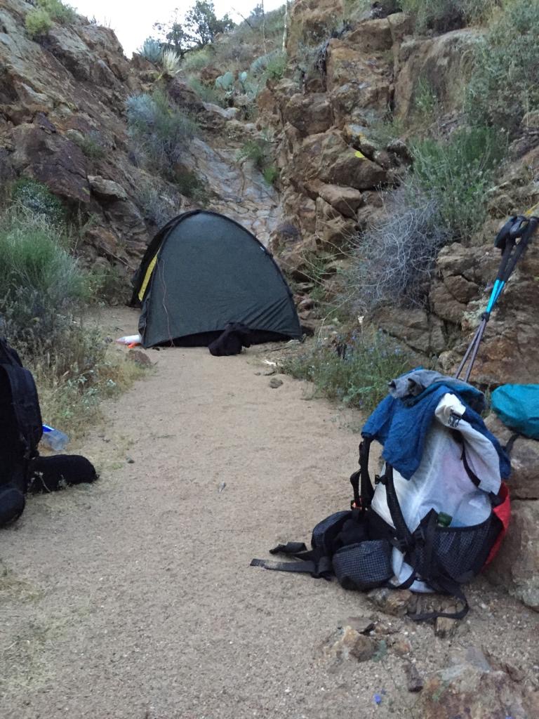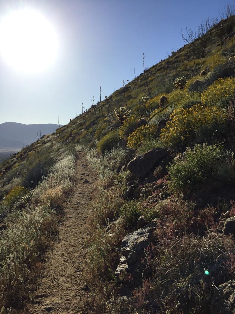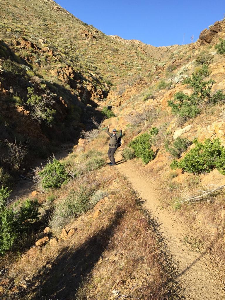 So gegen 16 Uhr geht es wieder los, zuerst mit Autostopp zurück zum Weg. Unser Fahrer lebt hier und ist von California enttäuscht, er findet, die Regierung gäbe seinem Staat an Mexiko ab. Und dass viele Menschen hier auf der Strasse oder in einem Trailer leben. In San Diego haben wir selber einen Parkplatz gesehen, wo Leute in Autos geschlafen haben. Er hat uns noch erzählt, dass es in der Gegend früher viele Goldminen gegeben hat und jetzt noch vereinzelt hat. Sein Auto war schlecht beieinander und ziemlich laut, so dass es schwierig war dem Gespräch zu folgen. Lustig war, dass alle Teile, die halten mussten, mit Silicon-Baukleber befestigt waren, sogar der Außenspiegel. Mit einem solchen Fahrzeug in der Schweiz zur Fahrzeugkontrolle, das wäre mal was. Als Schweizer staunst du oft, in welchem Zustand teilweise die Wagen sind. Der Fahrstil ist auch sehr sportlich, ich schwitze meistens mehr beim Autofahren als beim Wandern. Andy gibt dem Fahrer 10 $ für die Fahrt, er wünscht uns alles Gute und wir ihm auch.