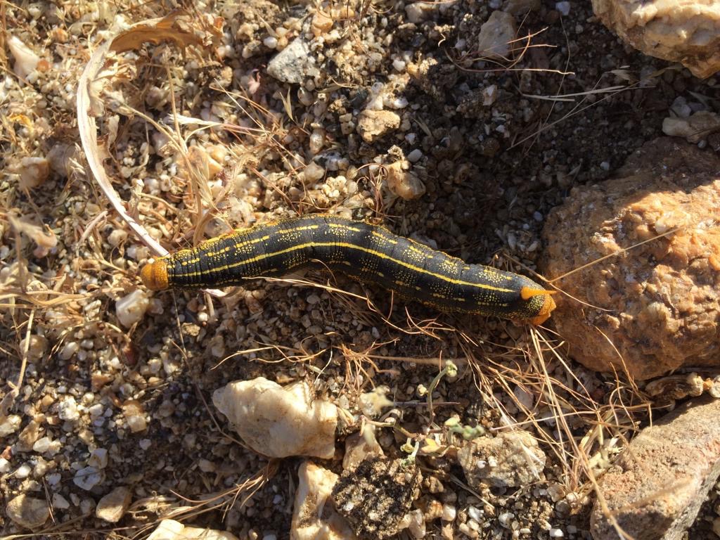 Bei der Scissors Crossing gehen wir zur Brücke, dort ist Wasser für die Hiker deponiert. Jeder von uns trinkt einen Liter und wir nehmen noch 7 Liter mit. Dann geht’s den Hang hinauf, in die San Felipe Hills. Die Kakteen fangen an zu blühen, drum sind wir wieder einmal mehr am Schauen und Fotos machen als am Wandern. Wir staunen über die vielen Schmetterlinge, zwei Raupen müssen auch als Motiv herhalten. Ich glaube langsam, wir haben zuviel Sonne abbekommen. Ab morgen werden wir konsequenter vorwärts laufen und weniger diskutieren. Sonst wird das nichts mit der kanadischen Grenze.