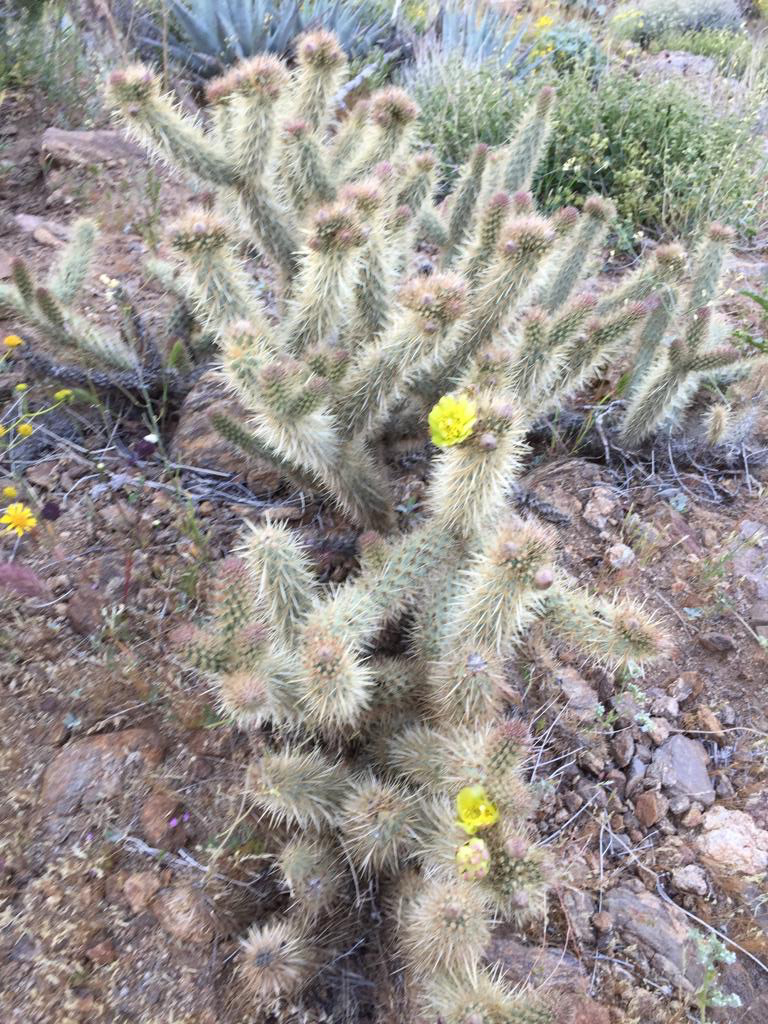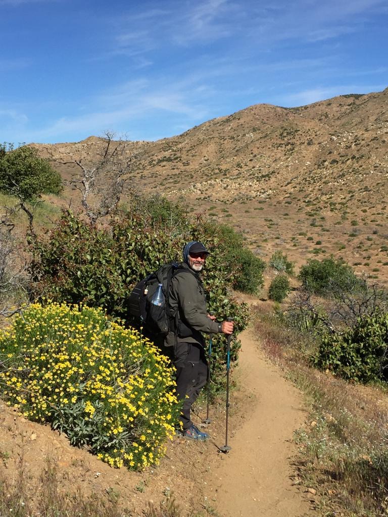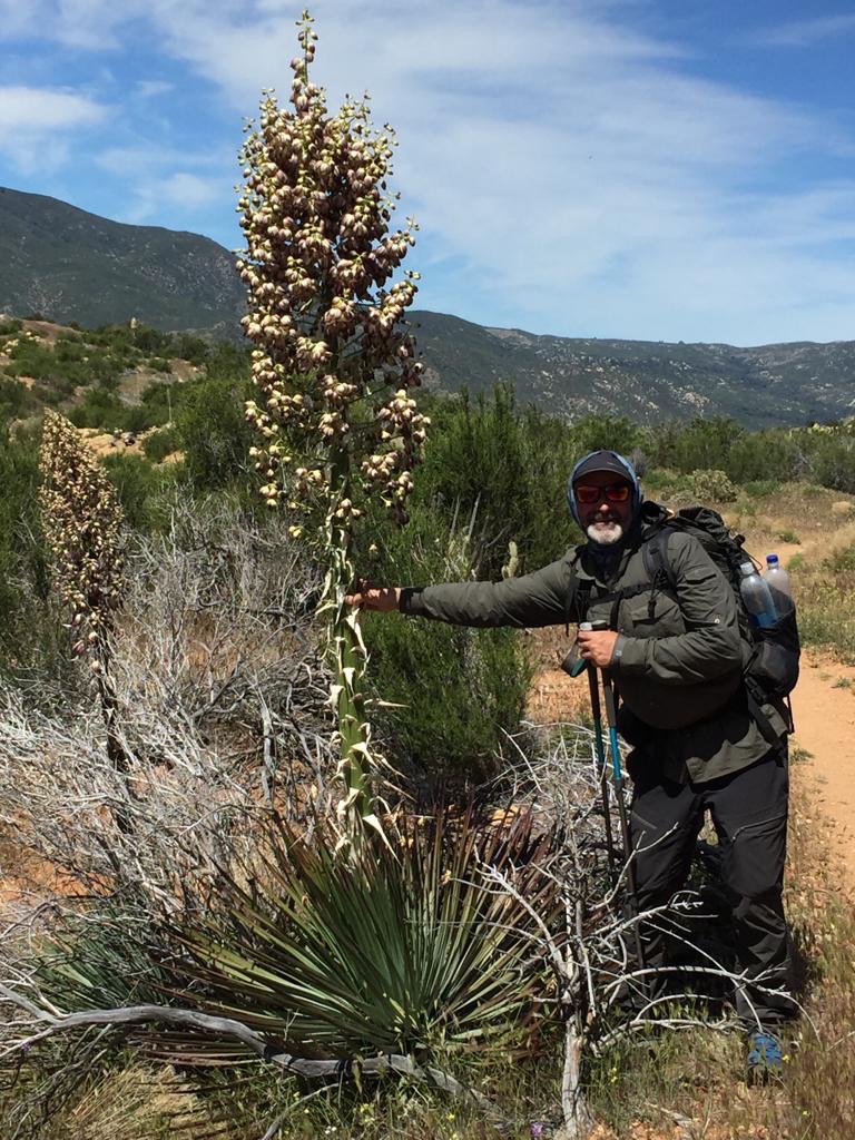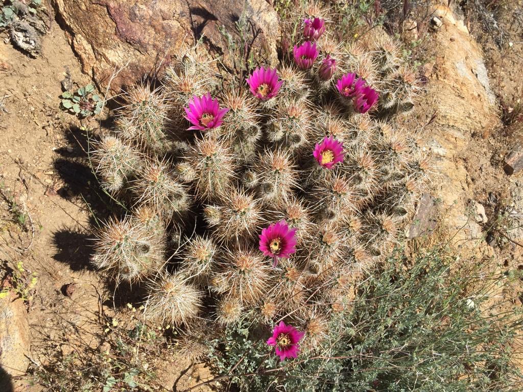 Der Weg steigt immer leicht an (San Felipe Hills), am Morgen ist dies sehr schön zu wandern. Die Morgenfrische, die aufgehende Sonne, all die Vögel und extrem viele Schmetterlinge, die immer vom Weg wegfliegen, alles recht hübsch. Der Hang ist mit allen Farben verziert, viele Kakteen blühen. Auch heute klappt es nicht wirklich mit zügig Laufen, ein verzweifelter Kaktus mit Blüten und viele andere müssen wir einfach fotografieren. So laufen wir etwa drei Stunden und dann setzen wir uns einfach auf den Weg, schauen ins Tal, Andy macht Kaffee und wir frühstücken. Ich beginne zu schreiben, als Andy was von mir möchte sage ich: «He, bitte nicht den Künstler bei der Arbeit stören».