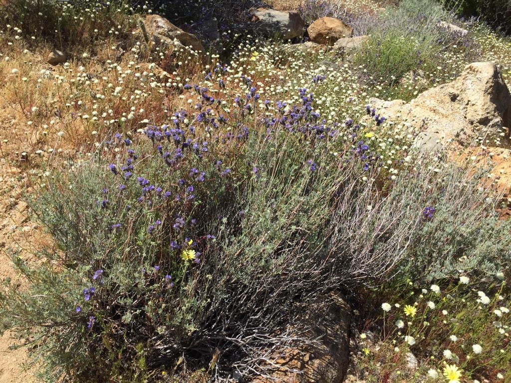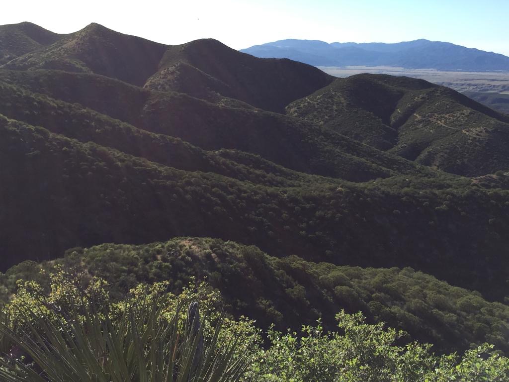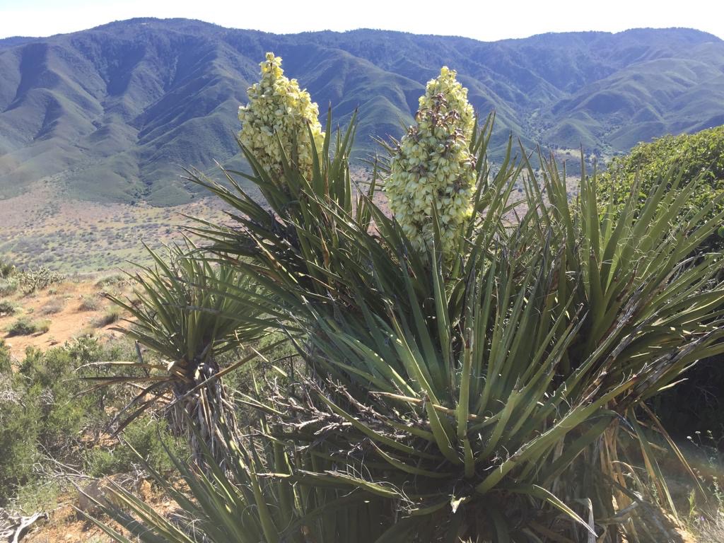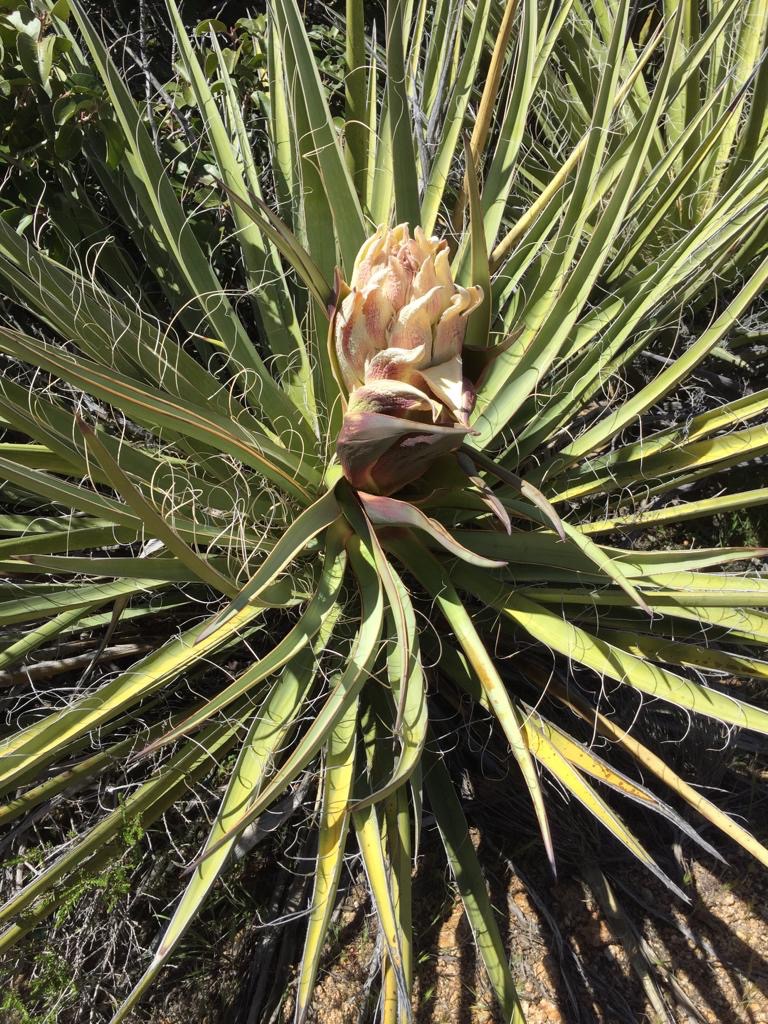 Der Weg steigt immer leicht an (San Felipe Hills), am Morgen ist dies sehr schön zu wandern. Die Morgenfrische, die aufgehende Sonne, all die Vögel und extrem viele Schmetterlinge, die immer vom Weg wegfliegen, alles recht hübsch. Der Hang ist mit allen Farben verziert, viele Kakteen blühen. Auch heute klappt es nicht wirklich mit zügig Laufen, ein verzweifelter Kaktus mit Blüten und viele andere müssen wir einfach fotografieren. So laufen wir etwa drei Stunden und dann setzen wir uns einfach auf den Weg, schauen ins Tal, Andy macht Kaffee und wir frühstücken. Ich beginne zu schreiben, als Andy was von mir möchte sage ich: «He, bitte nicht den Künstler bei der Arbeit stören».