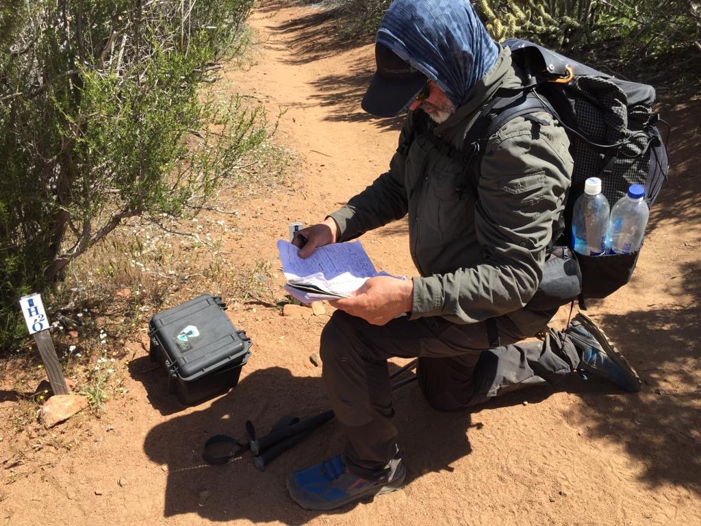 Nachdem wir uns beim Water Cache ins Trailregister eingeschrieben haben, holen wir uns noch 6 Liter Wasser im Ganzen. Um 12 machen wir Mittagspause, legen uns unter einen Busch bis etwa 3 Uhr, eine Siesta wie Cowboys. Danach ist es immer noch heiss, es geht vorerst rauf, nicht zu steil und in Schlaufen, zum Glück hat es nun etwas höhere Büsche. So ab 5 Uhr lässt die Hitze nach. Wir sehen ein herziges Tierchen, Andy nimmt es auf die Hand, damit wir es genauer anschauen können, ein schuppiges Echslein, wollen es unbedingt fotografieren. Wie zwei kleine Kinder benehmen wir uns. Wir beschliessen, jetzt ist Schluss, wir lassen uns nicht mehr ablenken.