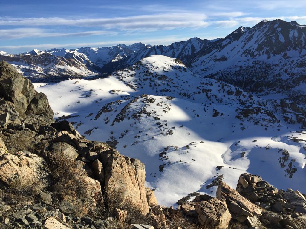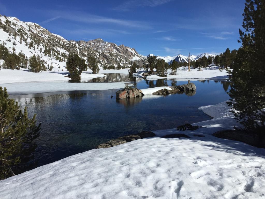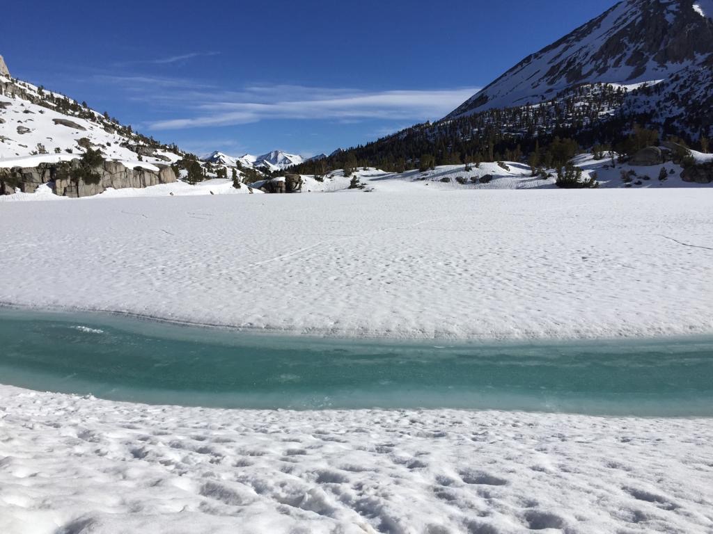 Oben angekommen sehen wir ins nächste Tal mit vielen kleinen Seen, die zugefroren sind, das ist sind sehr schön. Der Abstieg im schrägen Hang nach unten ist nicht ganz ‚ohne‘, besser nicht ausrutschen hier. Wir laufen bis 12 Uhr durch das Tal, hier müssen wir immer wieder mal ein kleinen Fluss queren. Überall hat es Wasser, die Sonne bringt den Schnee zum Schmelzen.