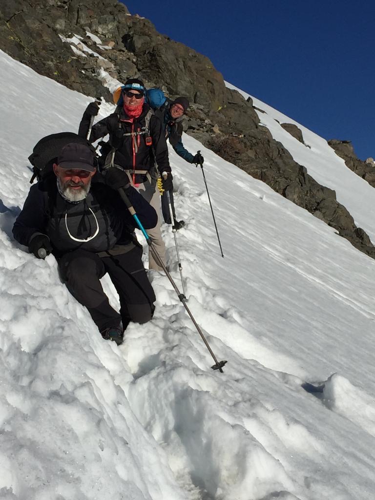 Patrizia brauchte Hilfe von Markus, ihre Heringe sind an die Steine angefroren. So nach 5 Uhr ziehen wir los und steigen hoch zum Glen Pass (11’980 ft oder 3’642 m.ü.M). Der Schnee ist gefroren, der Aufstieg ist sehr steil und streng.