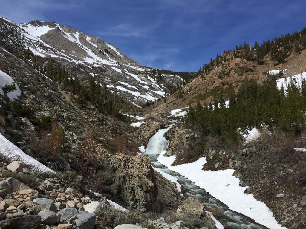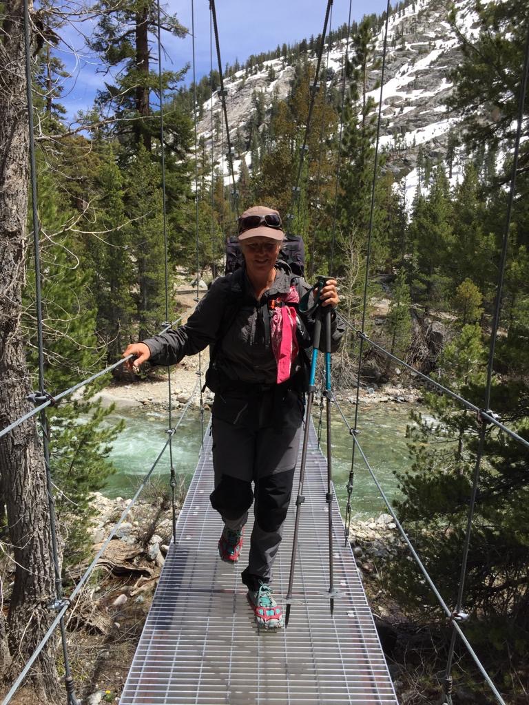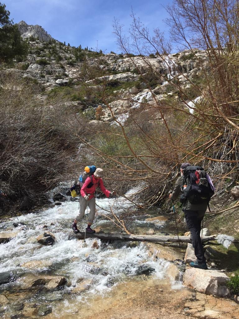Am Nachmittag laufen wir noch halb Richtung Pinchot Pass hoch. Der Woods Creek (eigentlich ein kleiner Fluss), der daneben hinunter fliesst, hat eine imposante Wassermenge. Zweimal müssen wir ein zufliessendes Gewässer queren, was gar nicht so einfach ist, wir müssen zuerst eine Stelle finden, wo es machbar ist. Man muss dann gut aufpassen, dass man nicht hineinfällt, denn bei dieser Menge Wasser und der hohen Fliessgeschwindigkeit wäre es nicht ungefährlich.