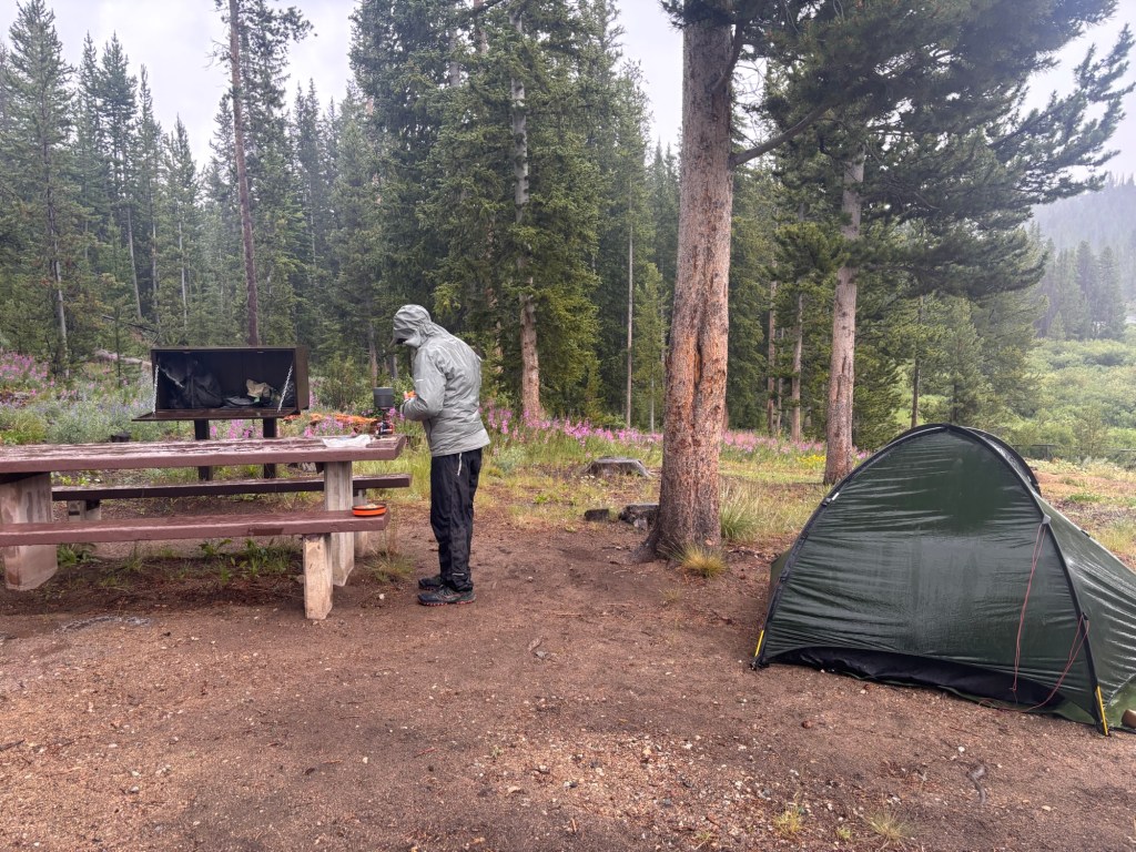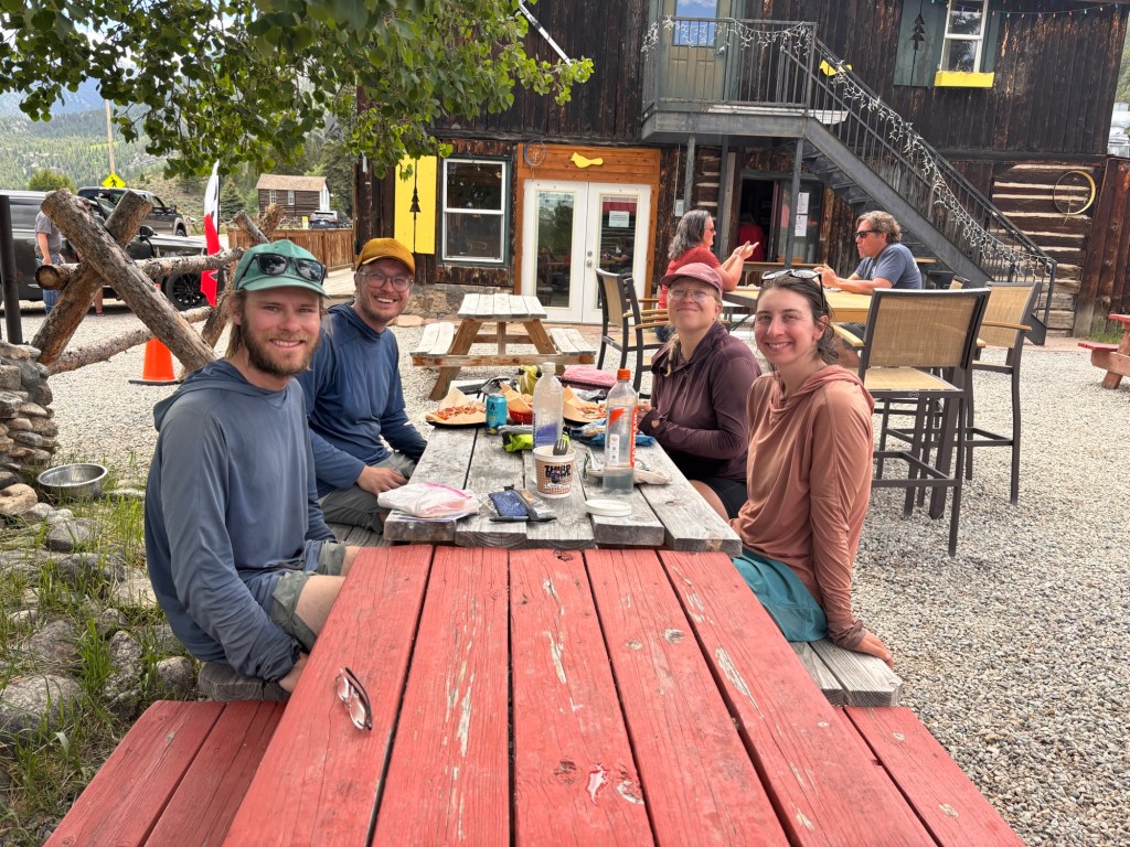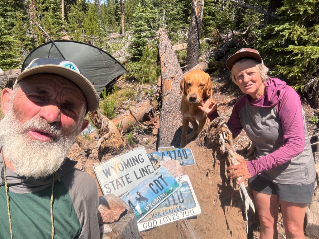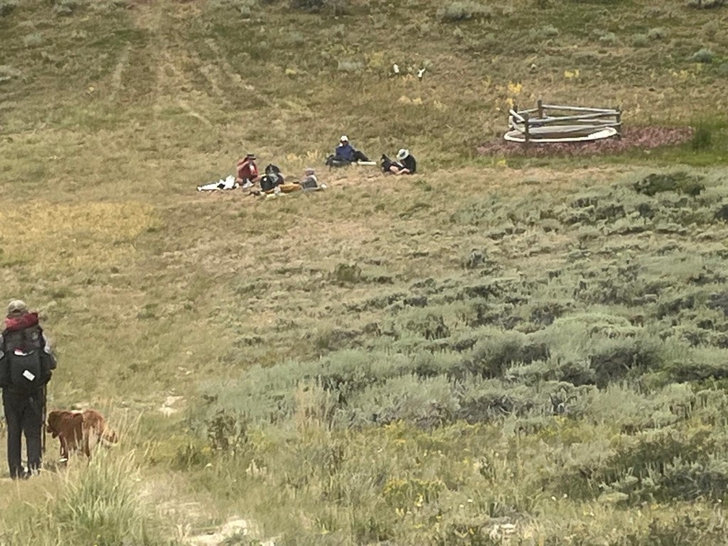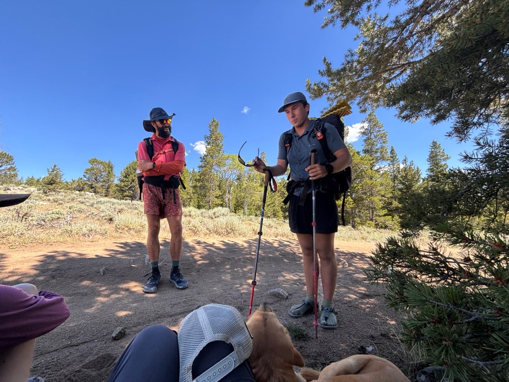 Der Weg zum Trail ist nicht einfach. Es geht etwas durch den Wald hoch ohne einen Weg zu haben. Um drei am Nachmittag sind wir bei einer Kuhtränke auf dem CDT Trail zurück. Dort Essen wir mit vier anderen Hikern.