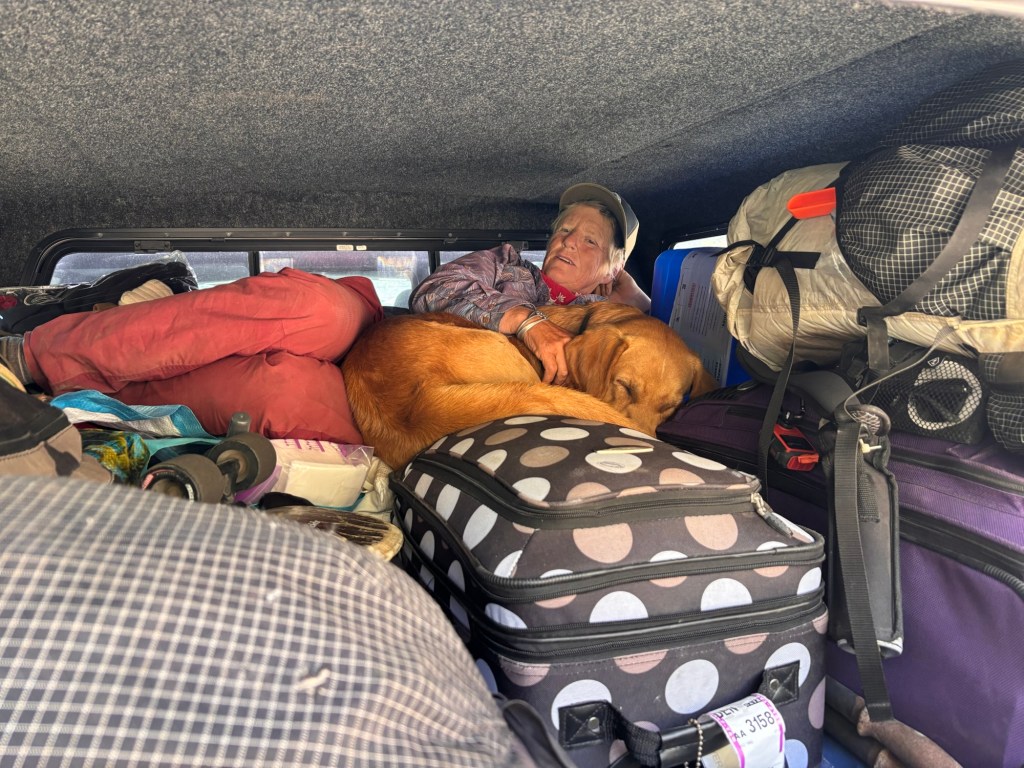 Draussen sind andere Hiker, die mit einem Auto die nächste Strecke umfahren aufgrund der Höhenmeter. Es ist auch bei einigen zu sehen, dass es anfängt zu genügen mit Wandern, es hören auch einige auf.