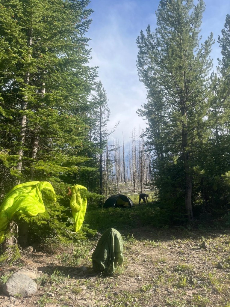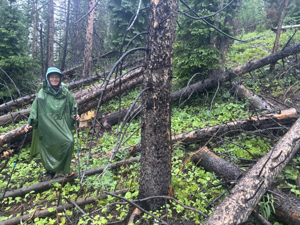 Das Zelt müssen wir später noch einmal aufbauen um es zu trocknen. Der Weg geht auch heute nochmals durch ein Gebiet, dass nicht viel gute Wasserstellen hat. Bei der Ersten werden wir kochen und alles Wasser auffüllen, so haben wir sicher genug bis zum Abend. Wir wandern durch teilweise sehr schöne Landschaft und dann wieder durch ehemalige Waldbrandgebiete.