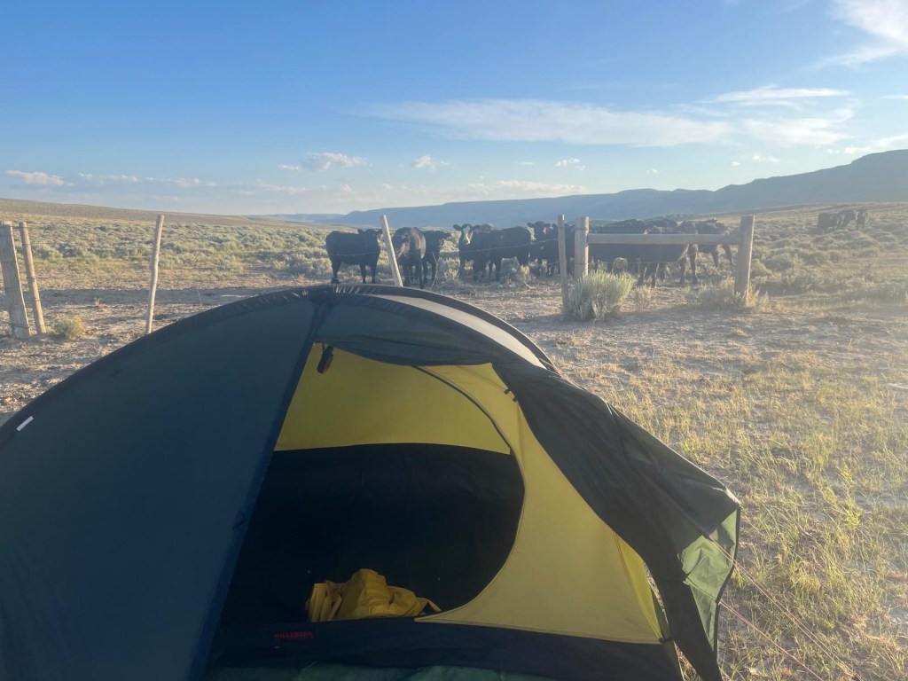 Wir müssen aufpassen, dass wir nicht zu weit gehen, es gibt hier noch ziemlich grosse Kuhherden. So werden wir vor der Weide zelten.