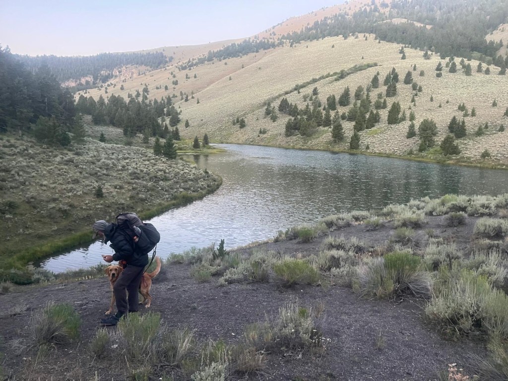 Ich laufe unterhalb nach vorne auf einer Piste für Vierradfahrzeuge. Er ist sehr interessiert jede Gelegenheit zu nutzen um noch ein paar Höhenmeter zu machen. Wir essen bei der ersten Wasserstelle, ein kleines Seelein. Für Kühe werden solche Wasserteiche gemacht, bis im Herbst sind sie dann meistens ausgetrocknet. Leeroy nimmt noch ein Bad, was die Wasserqualität jetzt sicherlich nicht verschlechtert. Es ist einfach so, das Wasser hier wird auf dem ganzen Trail immer ein Thema bleiben.