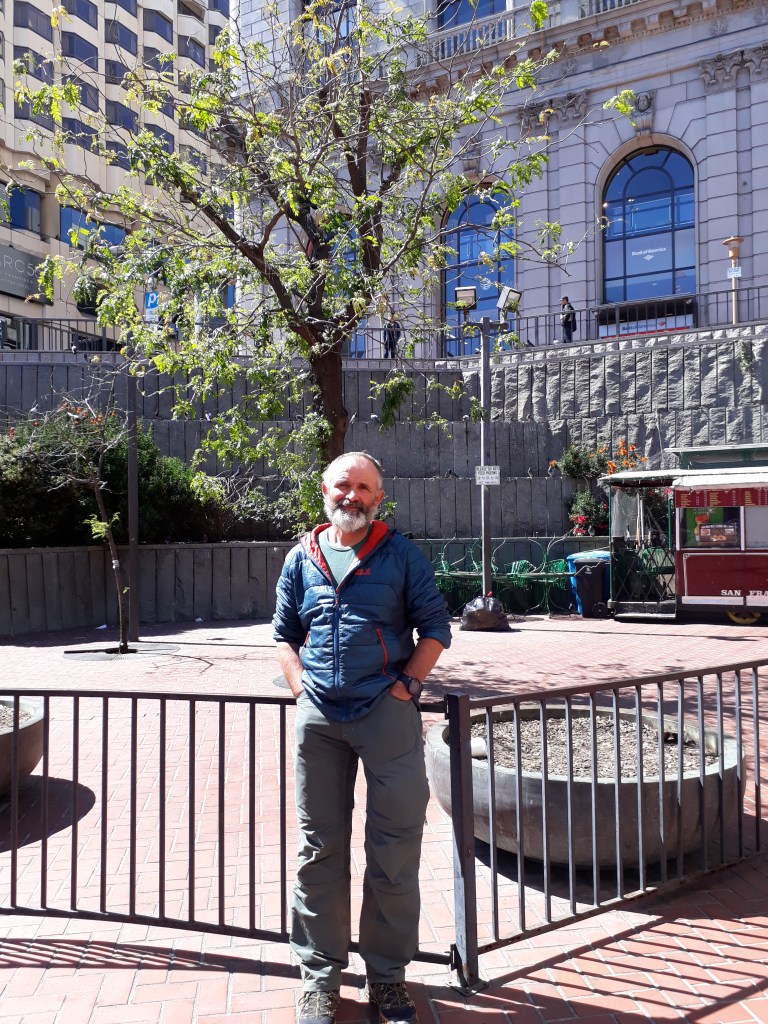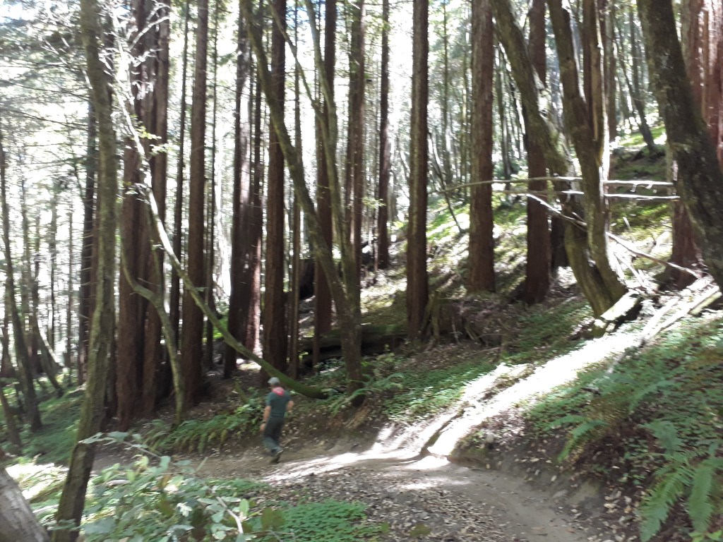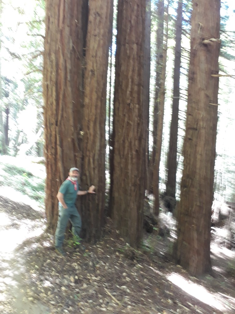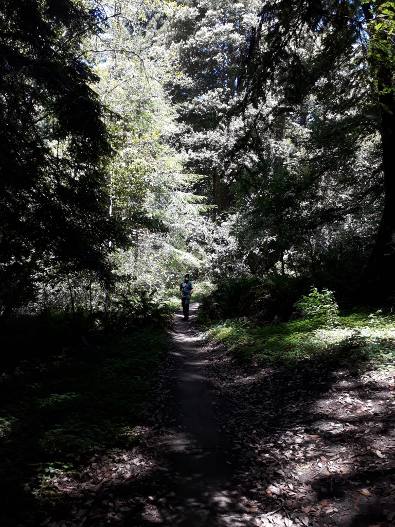 Nils fragt uns, ob wir mit ihm noch eine Wanderung machen würden, die er vor Jahren mal gemacht hat. Zum Glück sind wir mitgegangen. Zuerst geht es von der Küste immer hinauf. Leider hat er schon beim Bergauflaufen recht Probleme, er ist von einer Operation am Herzen gesundheitlich angeschlagen. Oben angekommen geht es in ein Tal mit einem Wald voll mit Redwood Bäumen. Wenn es trocken sei, werde dieser Wald mit Helikoptern bewässert, erzählt er. Nils macht dann ein Nickerchen und Andy und ich gehen im Wald spazieren. Für Andy als Zimmermann ist das ganz speziell, er arbeitet viel mit diesem Holz und steht jetzt vor diesen gigantischen Bäumen.
