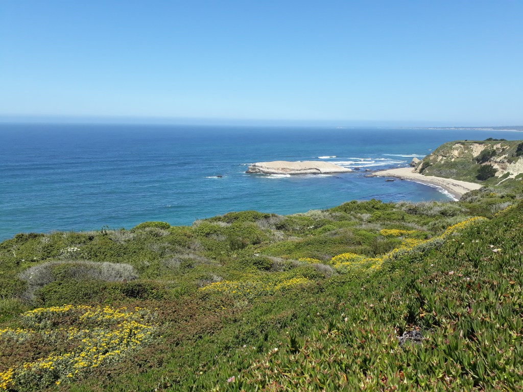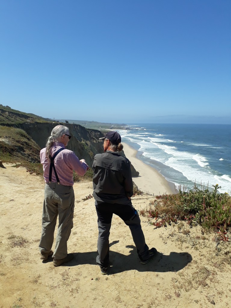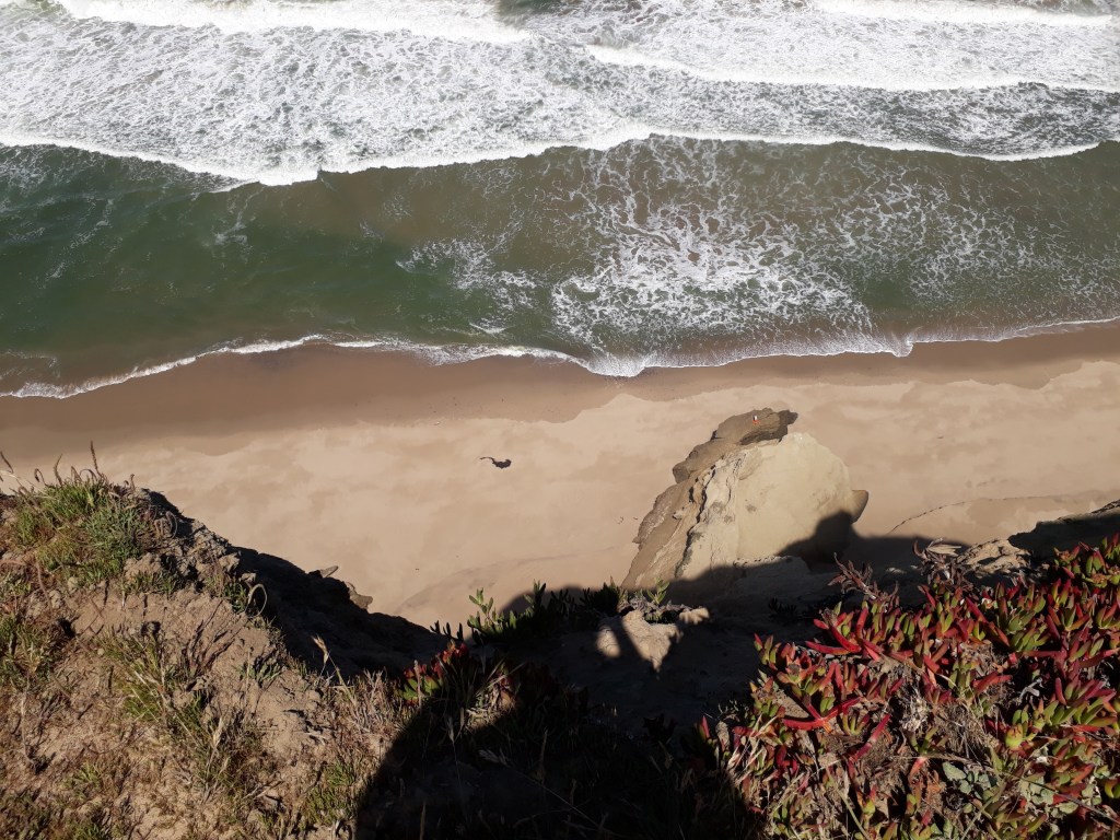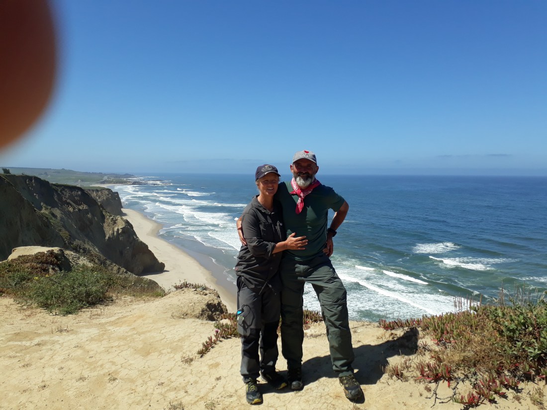 Bei einem Einkaufszentrum kaufen wir uns grosse Sandwiches und verputzen sie draussen an einen Tisch sitzend. Ein Mann kommt zu uns und fragt, ob wir hiken. Wir erzählen ihm, dass wir nach Santa Cruz unterwegs sind. Für ihn ist es kein Problem, uns dort hinzubringen. Er geht schnell einkaufen und dann geht`s los. Nils wohnt in dieser Gegend und hält an jedem Spot an. So sehen wir die tollsten Küstenabschnitte, den Leuchtturm, den Redwood Wald und eine Frau, die hier immer wieder die Klippen und das Meer malt.