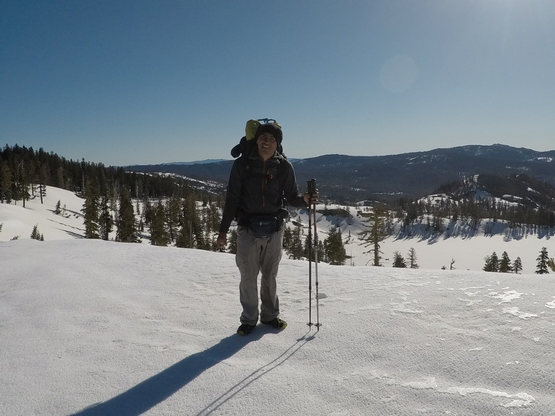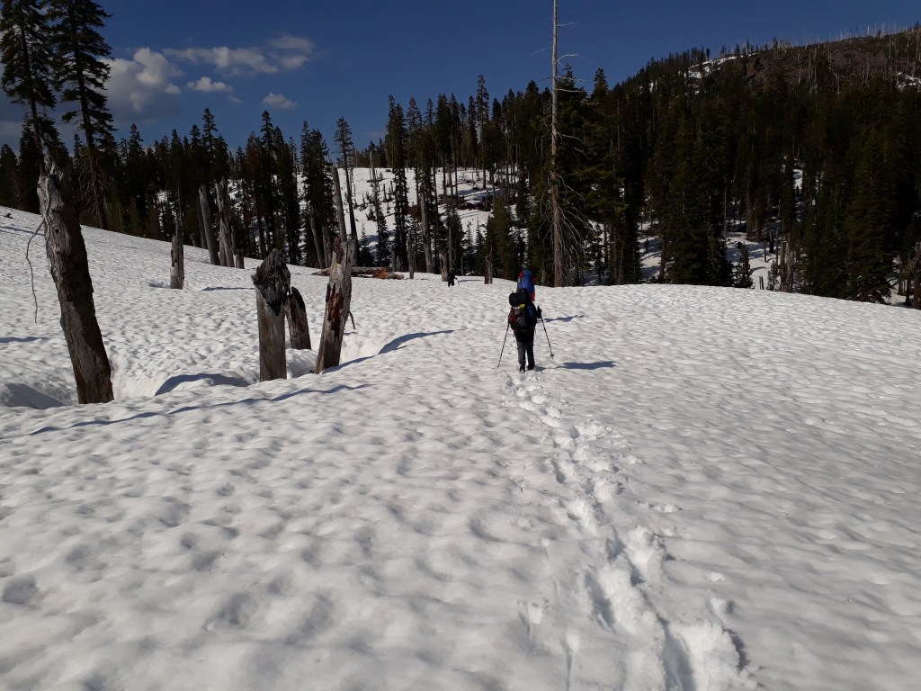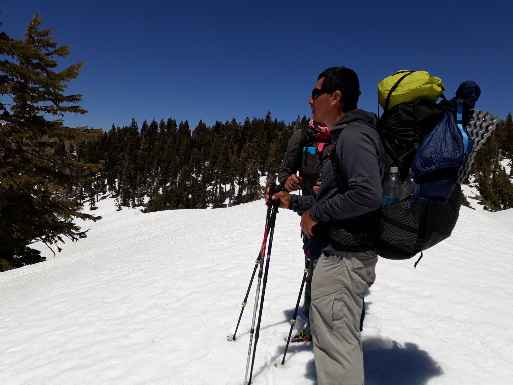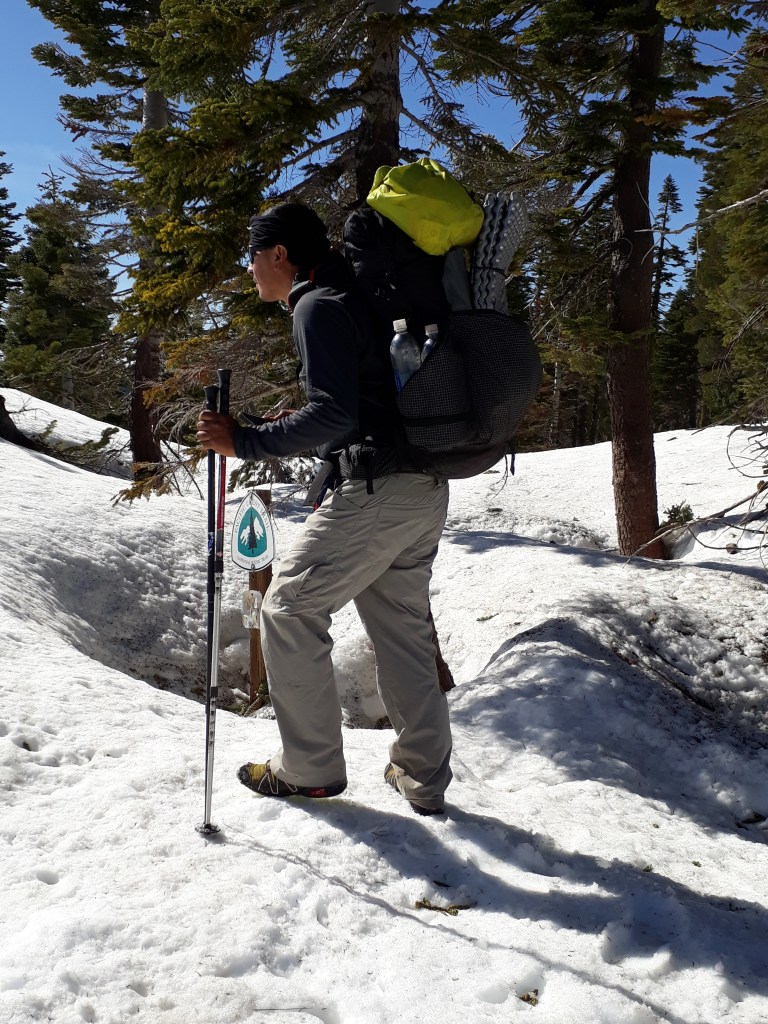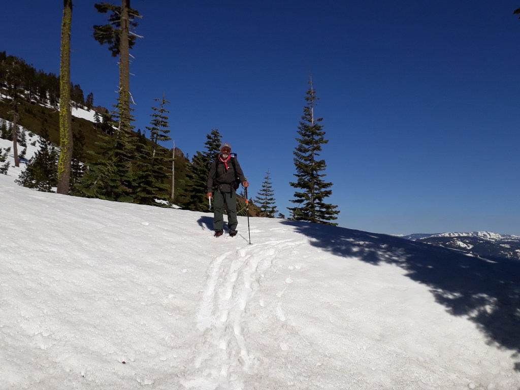 In einem Schneekurs, den wir in der Schweiz besucht hatten, hatten wir intensiv die Pickelbremse geübt. Mit weniger Gewicht funktioniert es gut. Aber mit so viel Gepäck auf dem Rücken, wäre es wahrscheinlich nicht gut ausgegangen.