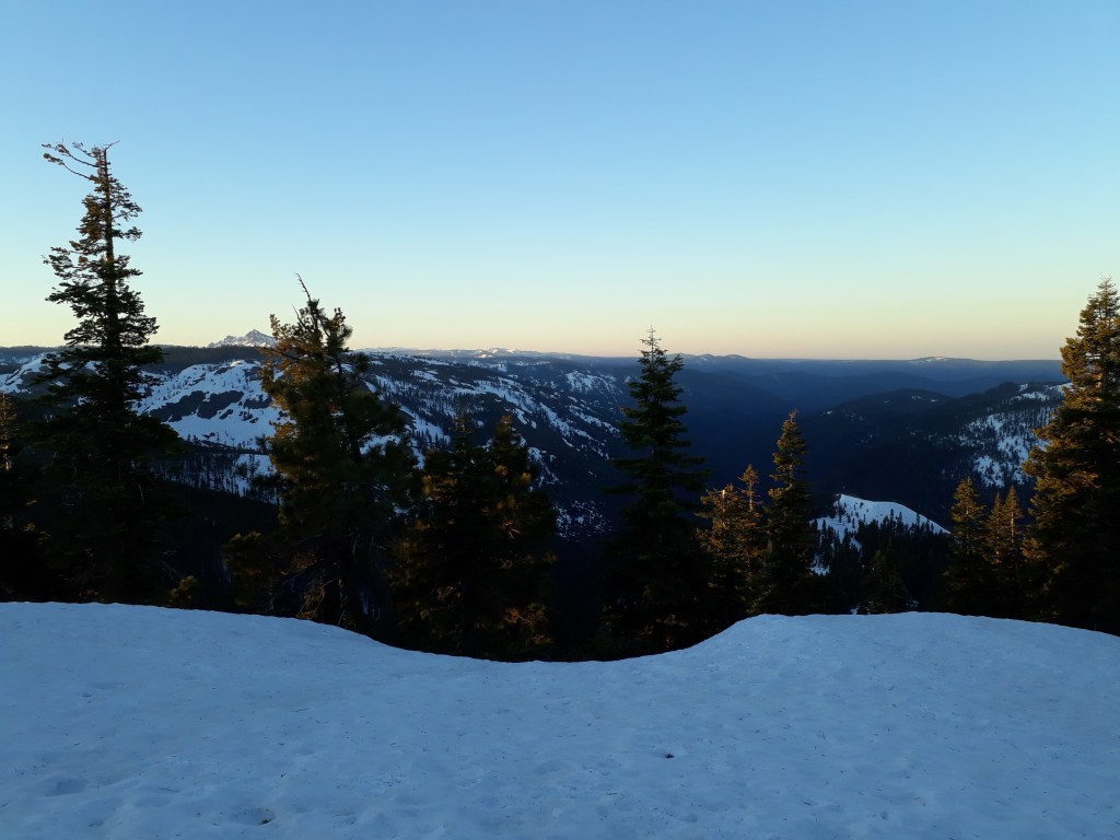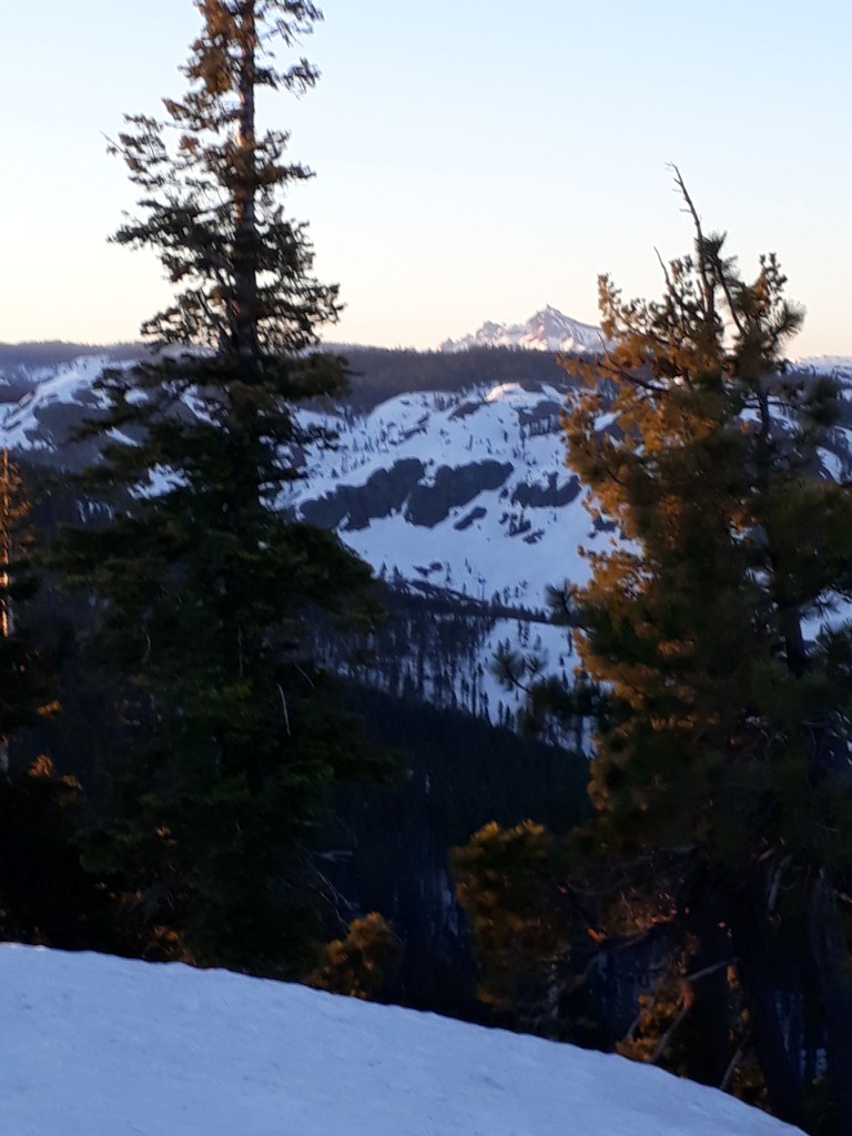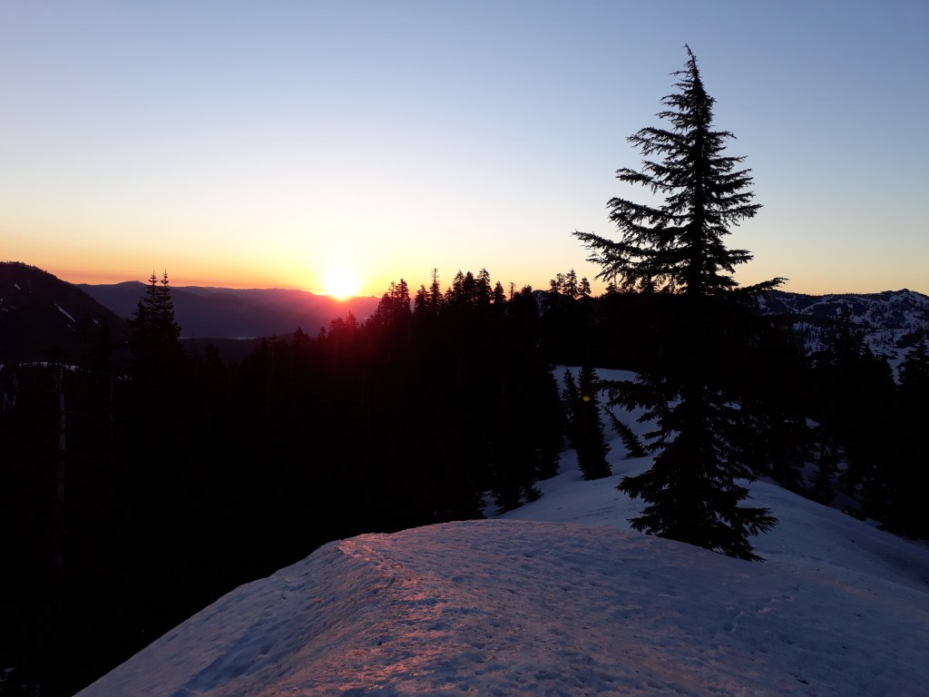 Auf einer Kuppe geniessen wir im Gehen einen wunderschönen Sonnenaufgang. Irgendwann müssen wir aber ins Tal absteigen. Jetzt wird es richtig schwierig, es geht etwa 800 Meter einfach steil nach unten. Für uns zwei wäre es kein Problem, einfach gerade hinunter stapfen, immer die Fersen hart in den Schnee schlagen. Aber mit jemandem, der das nicht kennt, ist das etwas anderes. In so einem Hang gehend erschrickst du jedes Mal, wenn jemand nur ein wenig rutscht.