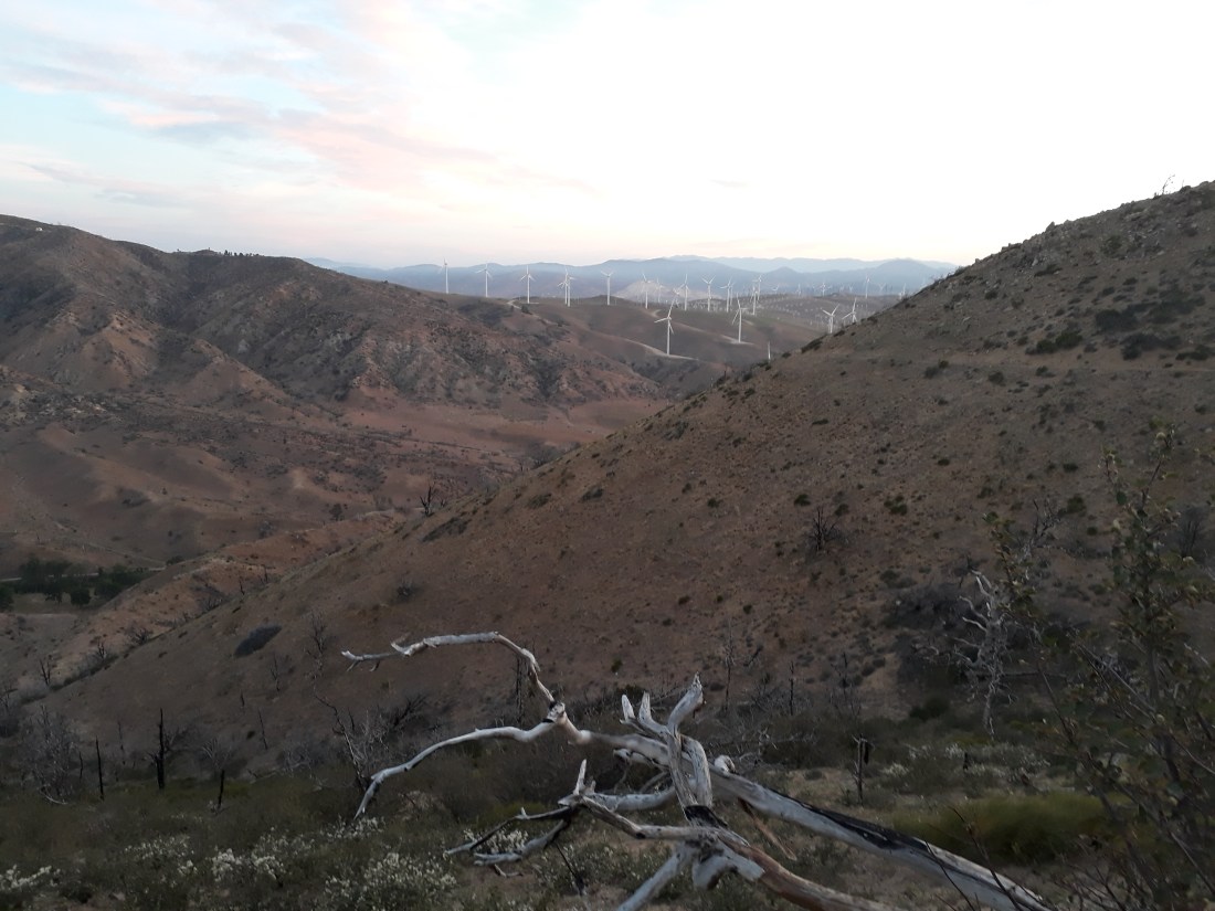 Heute wollen wir möglichst früh in Tehachapi sein. Vor 5 Uhr aufgestanden und alles durch den Wind und Windparks gelaufen. Wir sehen immer wieder frische grosse Spuren auf dem Weg. Ich sage, dass dies ein Bär sein muss. «Sicher nicht! Hier hat es noch keine Bären», verneint Andy. So? Dann muss es aber ein sehr grosser Hund sein, oder was sonst? Egal, es windet stark und wir gehen meistens oben auf dem Kamm. Im Tal ist es sehr grün, sicher ein Privatgrundstück, drum gehen wir oben.