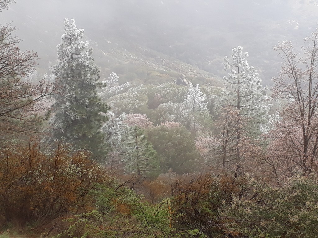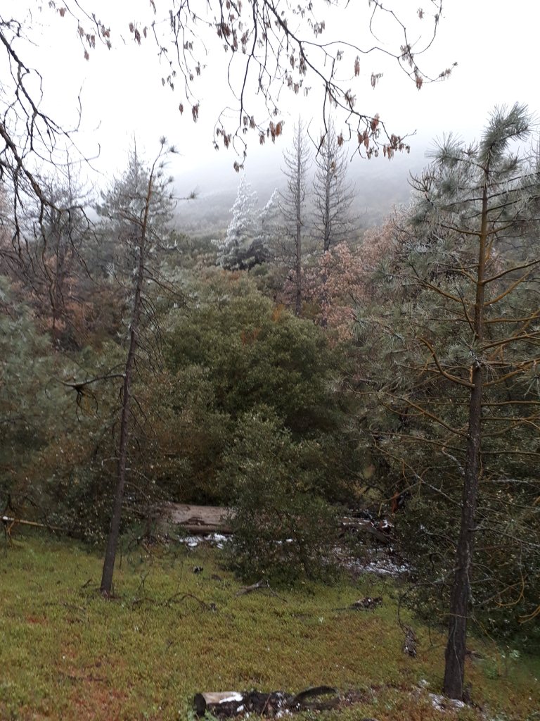 Weiter unten im Wald treffen wir Medical, er ist erst aufgestanden. Er kann es nicht fassen, Schneefall in der Wüste! Wir plaudern etwas und fragen ihn nach WC Papier, denn in Tehachapi hat es Andy vergessen einzukaufen. Medical ist recht knapp mit seinem, aber gibt uns etwas ab. Auf dem Trail hilft man sich gegenseitig aus so gut es geht. Jeder ist mal froh um Hilfe.