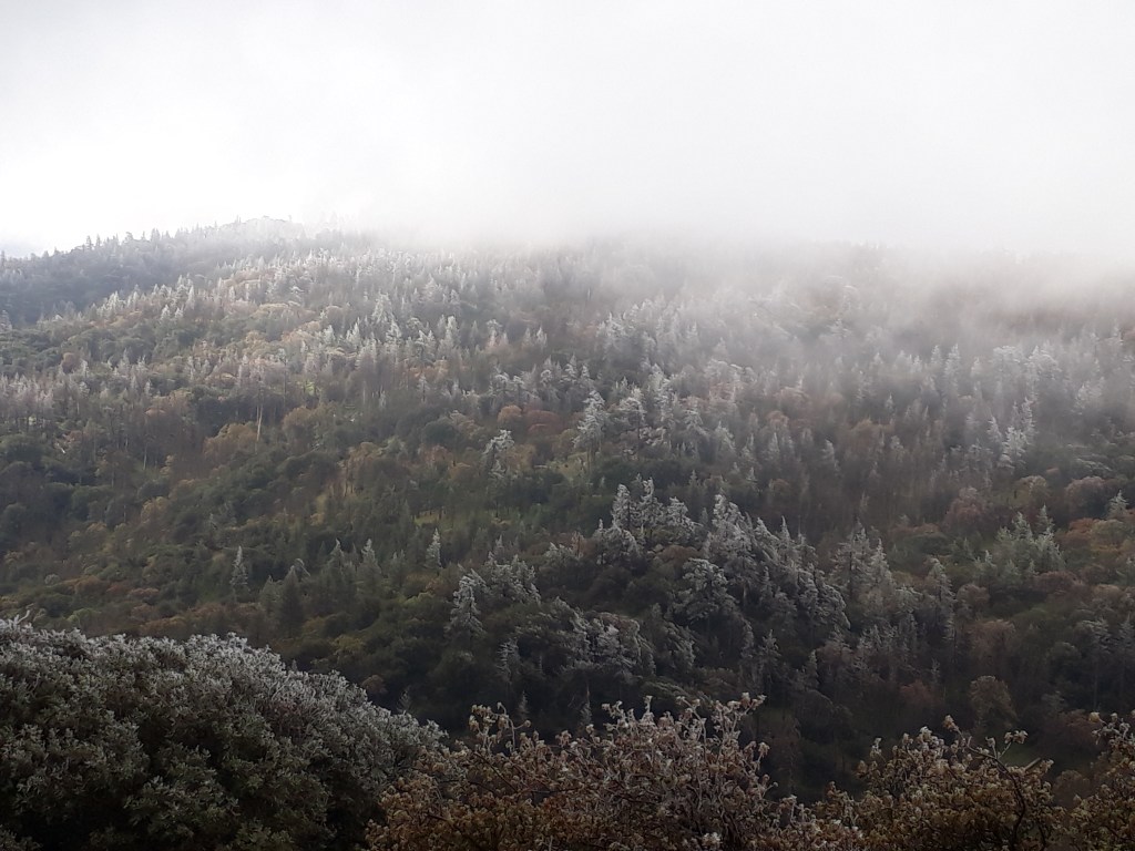 Erst um 7 Uhr aus dem Schlafsack gekrochen, Schnee. In der Nacht hat es auf unser Zelt gerieselt, wir dachten, das wären Nadeln von den Bäumen. Doch es hat tatsächlich geschneit und ist richtig kalt. Wir ziehen heute zum ersten Mal Handschuhe an, und Mützen und Blufft, dann geht’s. Vom Zelt schütteln wir den Schnee ab und müssen es nass einpacken, vielleicht können wir es später trocknen.