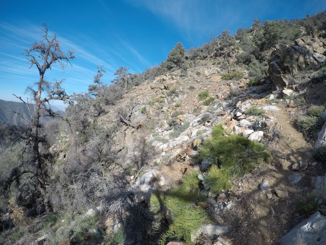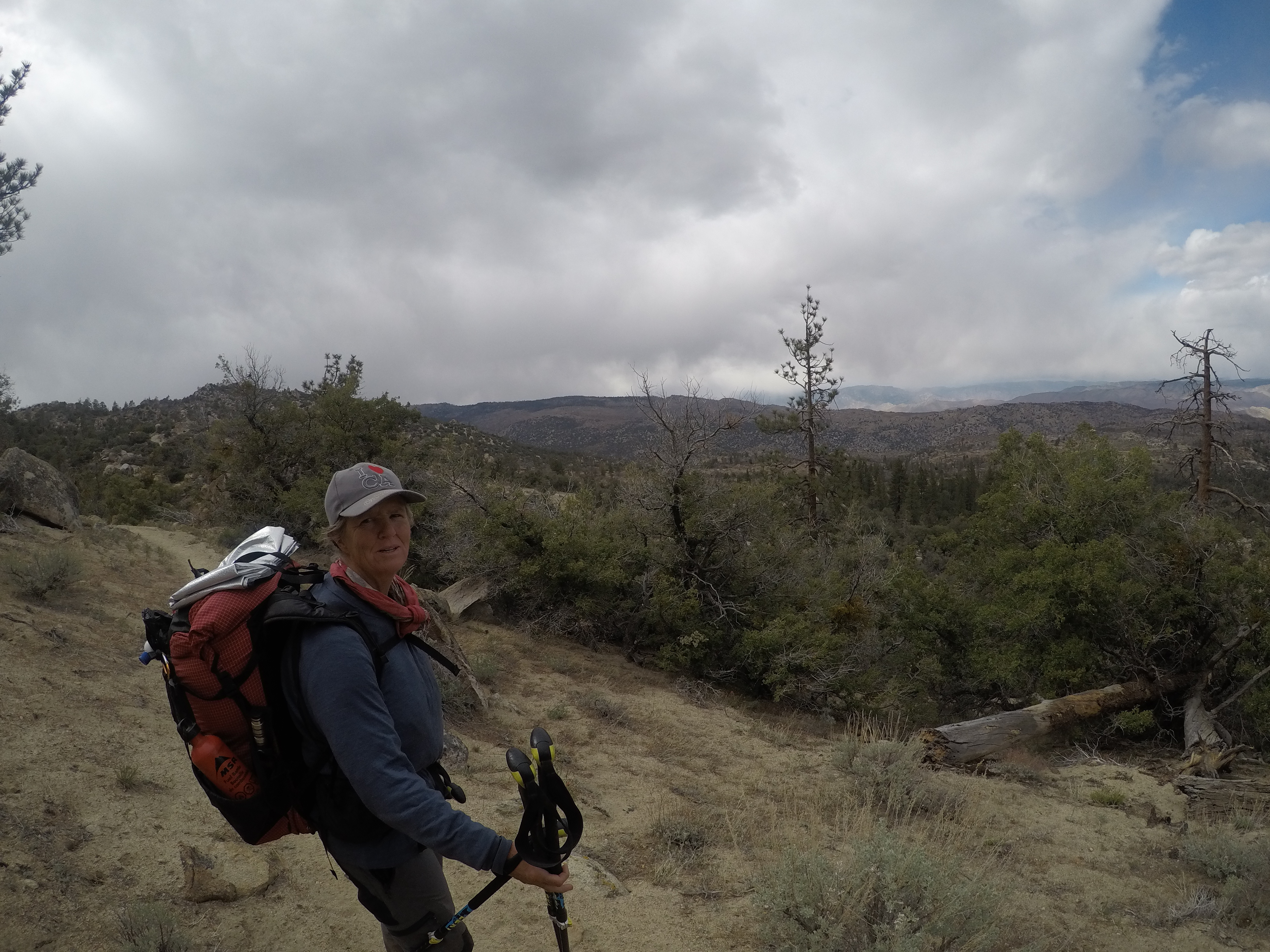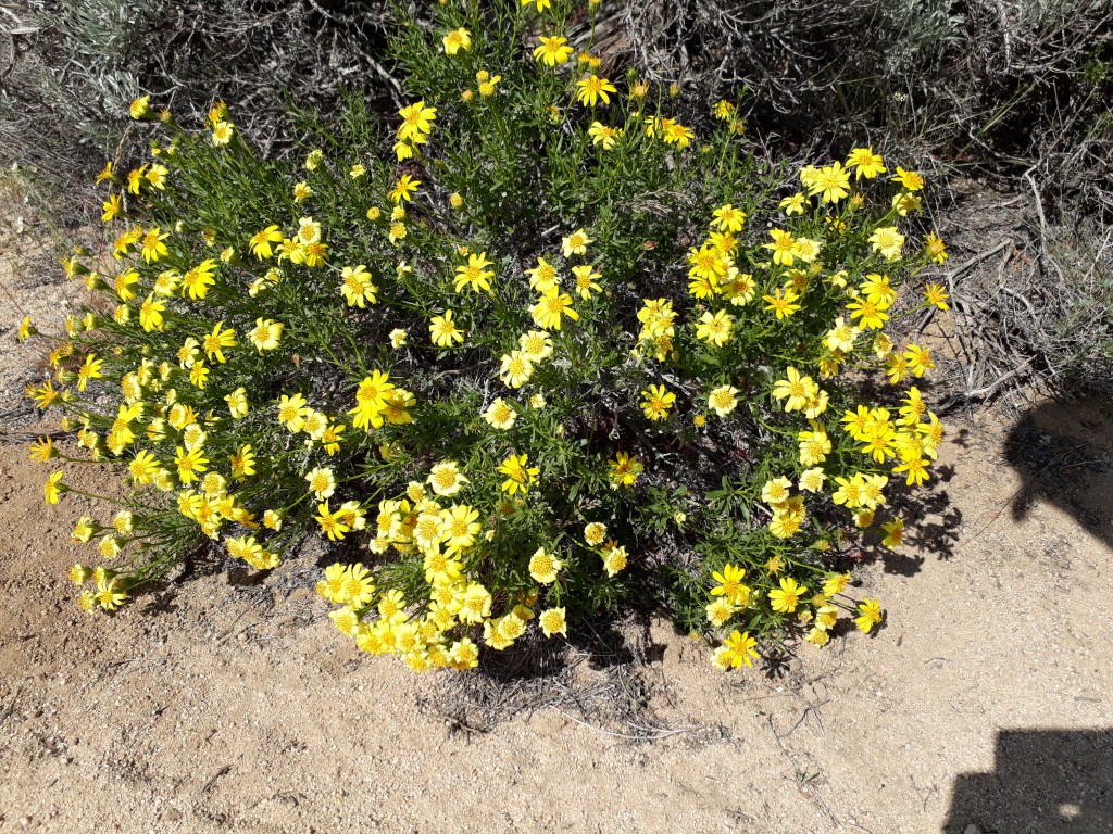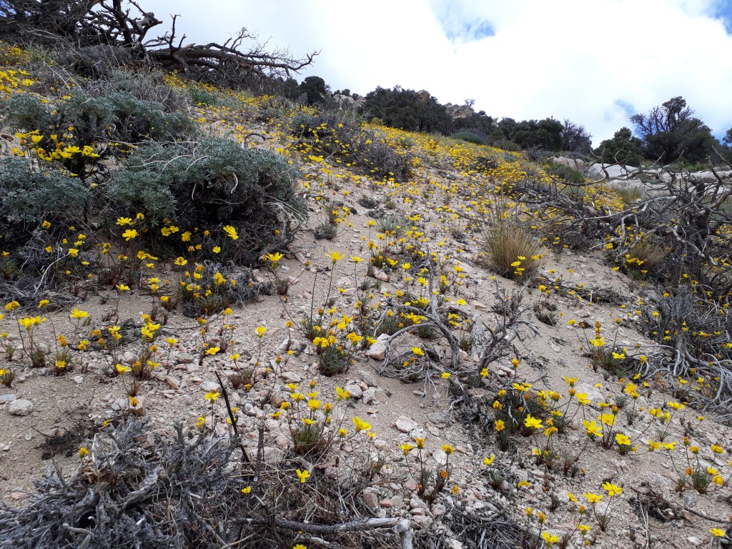 Am Nachmittag sind wir hinunter in ein Tal gewandert, um danach gleich wieder auf der anderen Seite hochzusteigen. Immer Richtung Kennedy Meadows, solange es geht. Die Gegend war weniger schön, alles verbrannt. Nur viel Sand, kleine Büsche und ab und zu einige kleine Blumen, die sahen recht hübsch aus.
