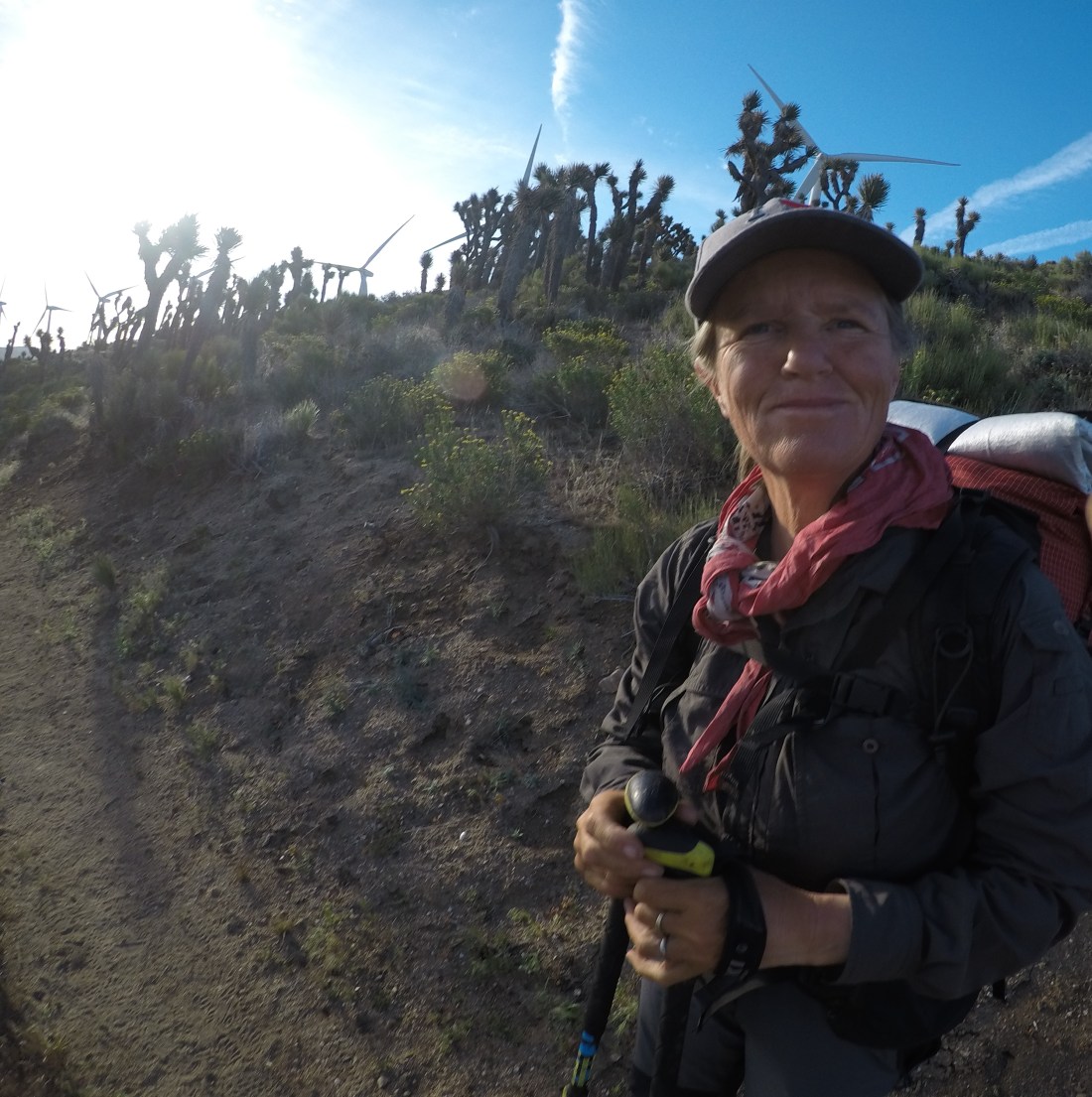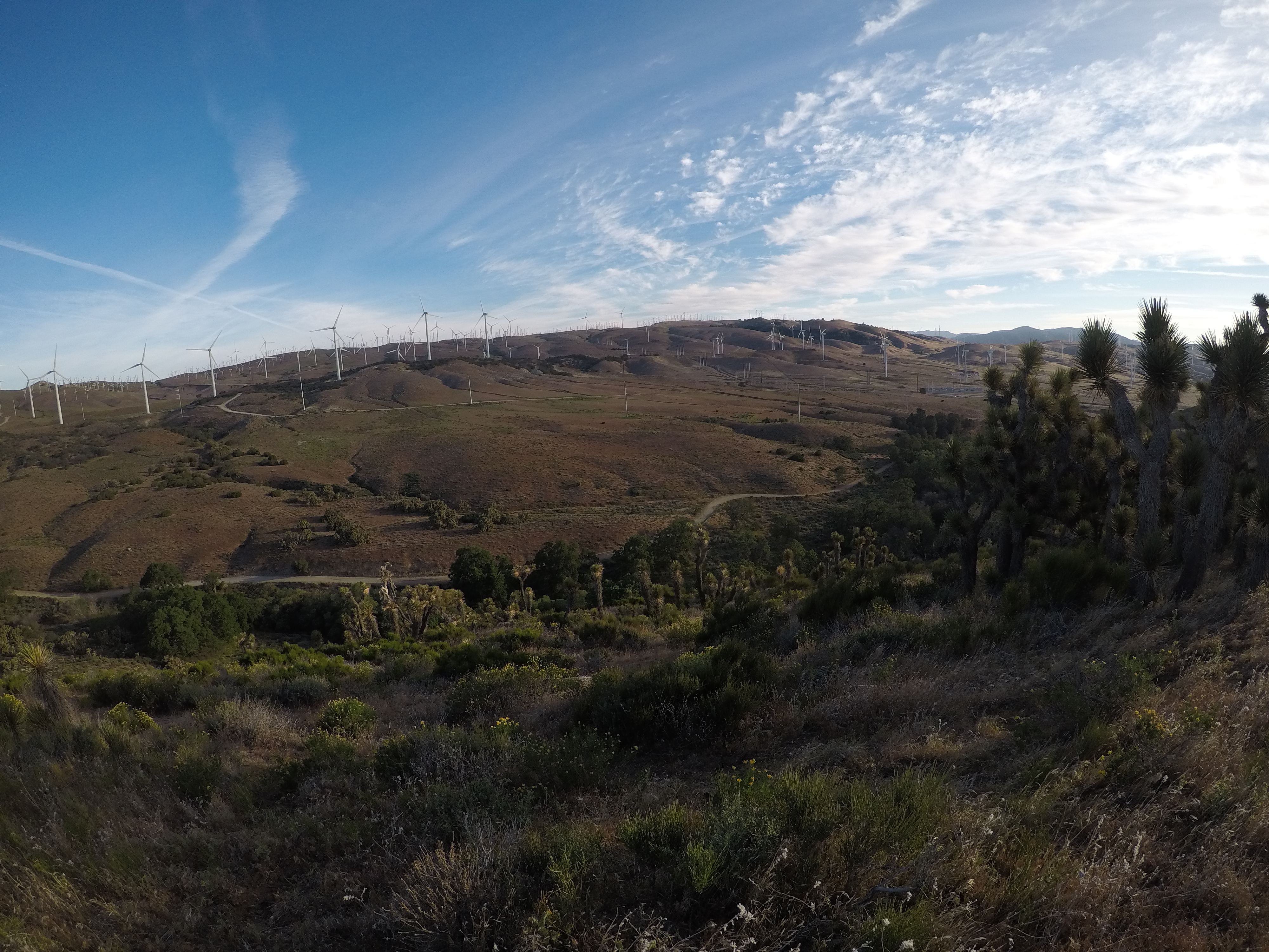 Gegen 10 Uhr kommen wir an die Strasse, welche nach Tehachapi führt. Wir konnten von oben sehen, dass ein Hiker Autostopp machte. Wir gingen zu ihm und stellten uns auch hin. Er sagte, ich sollte es versuchen, vielleicht hätte ich mehr Glück. Bei mir klappt es aber auch nicht. Daraufhin meint Andy, dass wir es eben falsch machen würden. Er zeigte etwas von seinem Bein. «So wird das nichts!», lachen wir ihn aus, doch es hält eine junge Frau mit einem BMW SUV an, die hier im Windpark arbeitet. Sie fragt uns, was wir dabei haben, um uns in der Wildnis zu schützten, worauf Andi seine Faust zeigt. Sie lacht und findet wir seien verrückt. Sie würde nicht mal auf einen Spaziergang gehen ohne Waffe, sie habe sogar im Auto Waffen dabei.