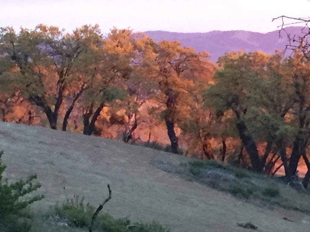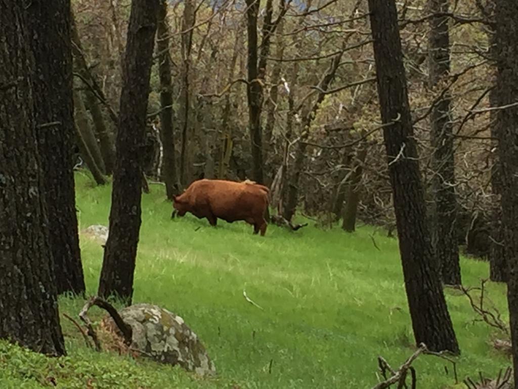 Zuerst geht es durch eine kahle Gegend, und danach durch Farmland (Sageland) immer im Hang oben. Die Farm, durch die wir heute laufen, umfasst die ganze Strecke und noch mehr. Hier sieht man, dass es genügend geregnet hat in letzter Zeit, es hat Gras im Wald, alles blüht und viele Vögel schwirren umher. Es hat überall mal Kühe, die im Wald grasen.
