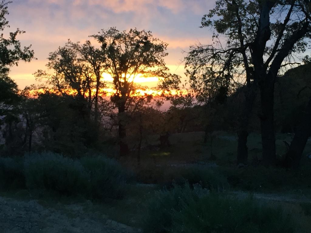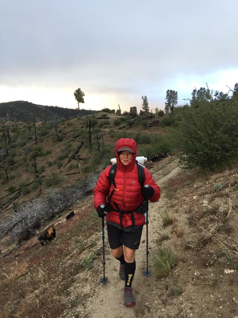 Um 4:30 Uhr am Morgen stehen wir auf und gehen mit Stirnlampe den Hang hinunter, es ist kalt und auch bewölkt, wir laufen zügig. Die aufsteigende Sonne färbt alles herbstlich ein, sieht schon recht schön aus mit dem Wald. Unten geht’s Richtung Highway 138, alles über Hügel in Schlaufen, wir laufen vom Zeltplatz bis Hiker Town (23 Kilometer) in einem Stück durch.