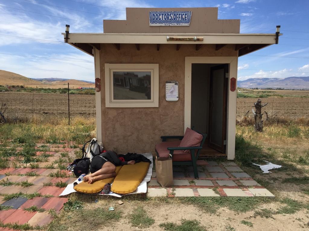 Als Erstes duschen wir und waschen die Kleider, dann gehen wir gleich ins Bett, aber mit Schlafen wird nichts. Der Dachdecker ist eingetroffen, über unserem Zimmer ist die Abdeckung zerrissen und die Baumulde, in die er die kaputten Teile wirft, steht direkt vor unserer Tür. In der Nacht hat dann die Heizung eingesetzt, sie knallte richtiggehend. Ich glaube, dieses Motel hat generell eine Renovierung nötig. Wir sind bei Trail-Kilometer 911 km oder PCT-Meile 566.