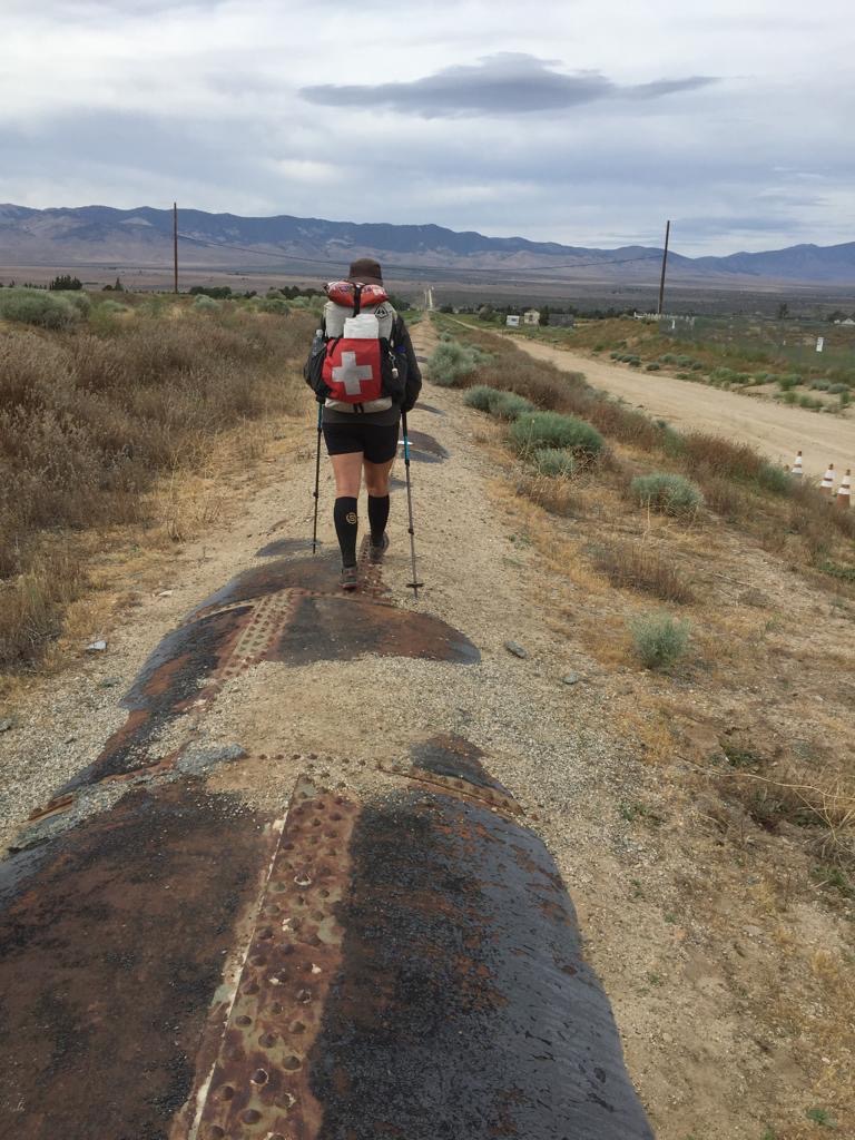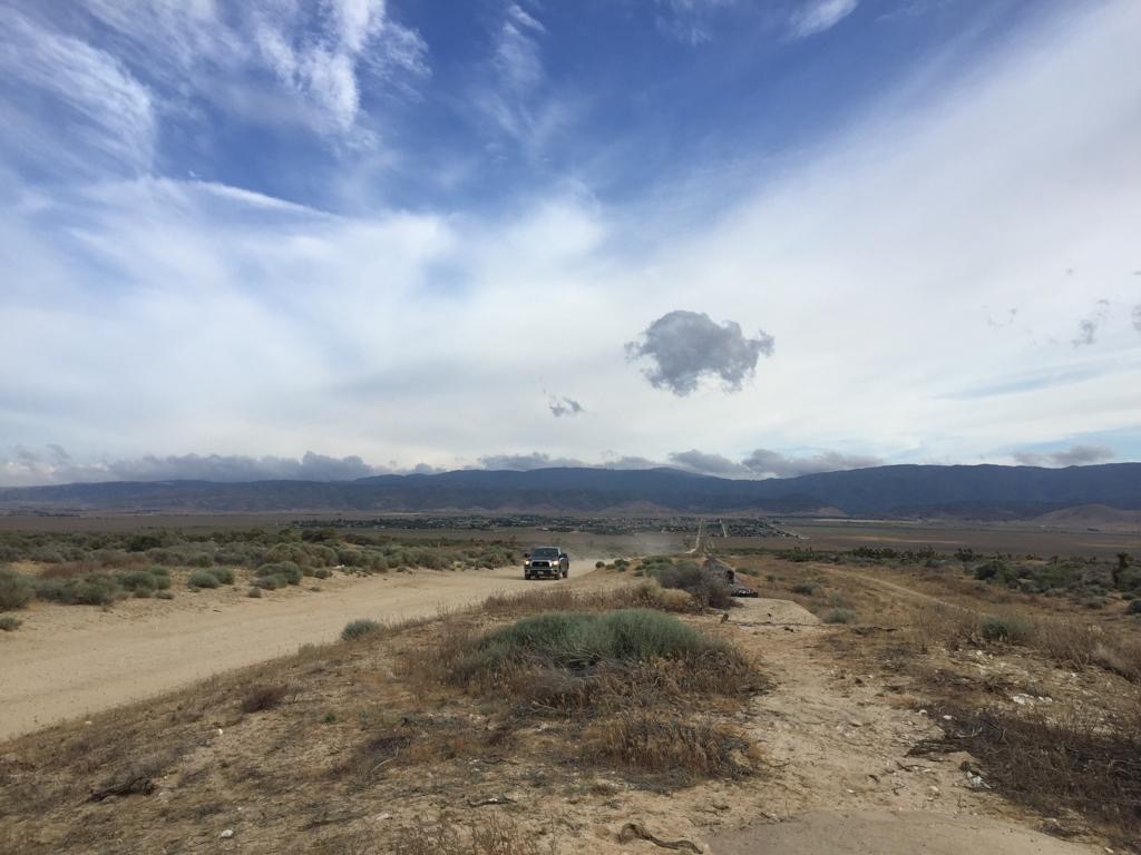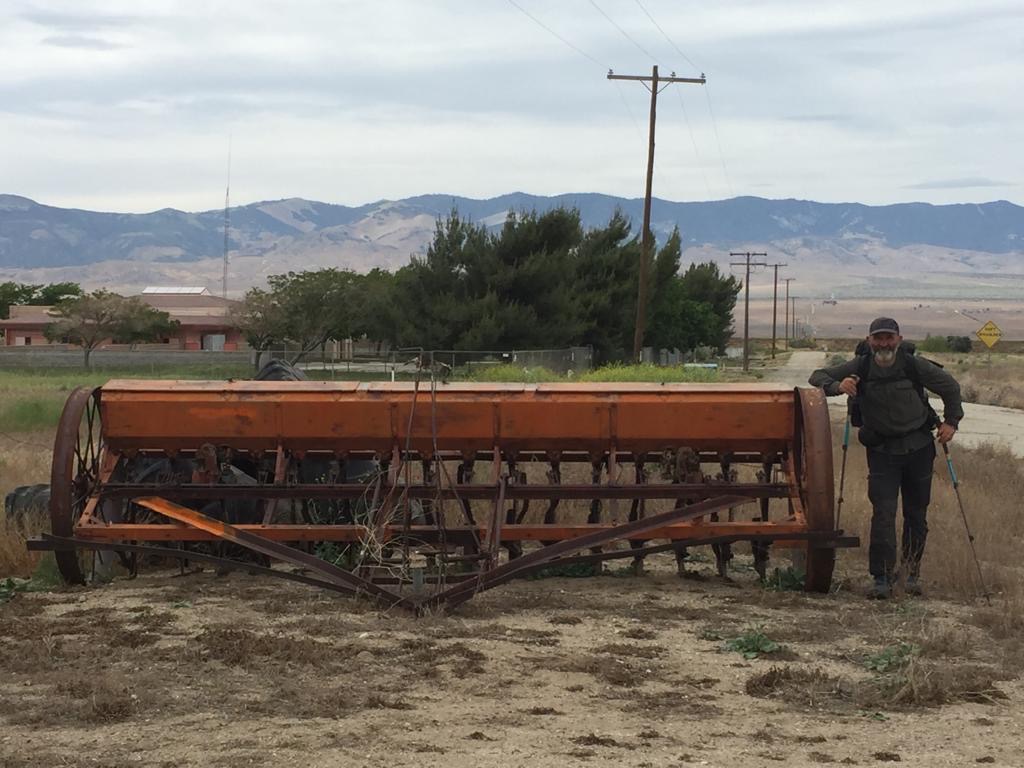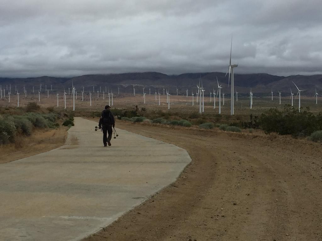 Andy möchte weitergehen, weil es ja bewölkt ist, mir ist’s recht, ich laufe die Strecke gerne tagsüber. Gewöhnlich macht man hier einen Nacht-Hike, durch die Mojave Wüste und dann durch die Windfarm, weil’s am Tag zu heiss ist. Es geht zuerst entlang dem Kanal California Aqueduct und dann über Los Angeles Aqueduct (Wasser in Pipeline), wir laufen 3 Kilometer geradeaus auf dem Wasserrohr. Es wird immer bewölkter, regnet zum Glück nicht, wir laufen bis halb acht noch Richtung Windfarm.