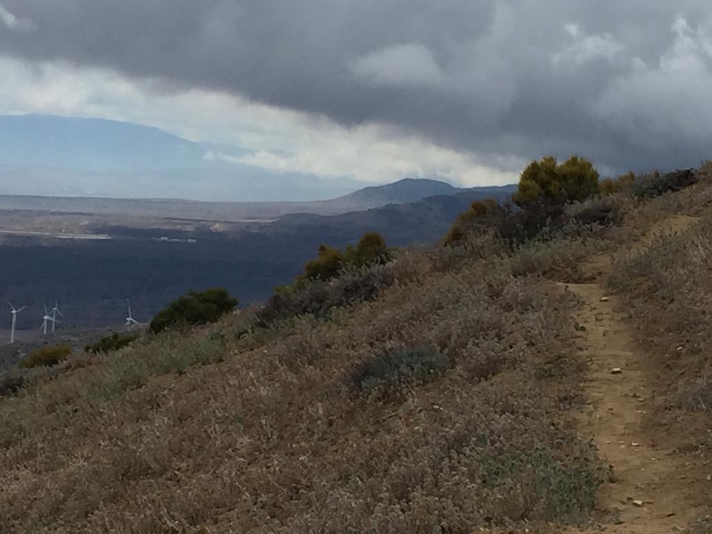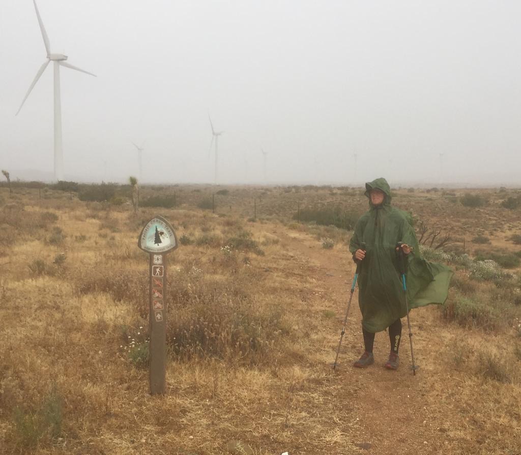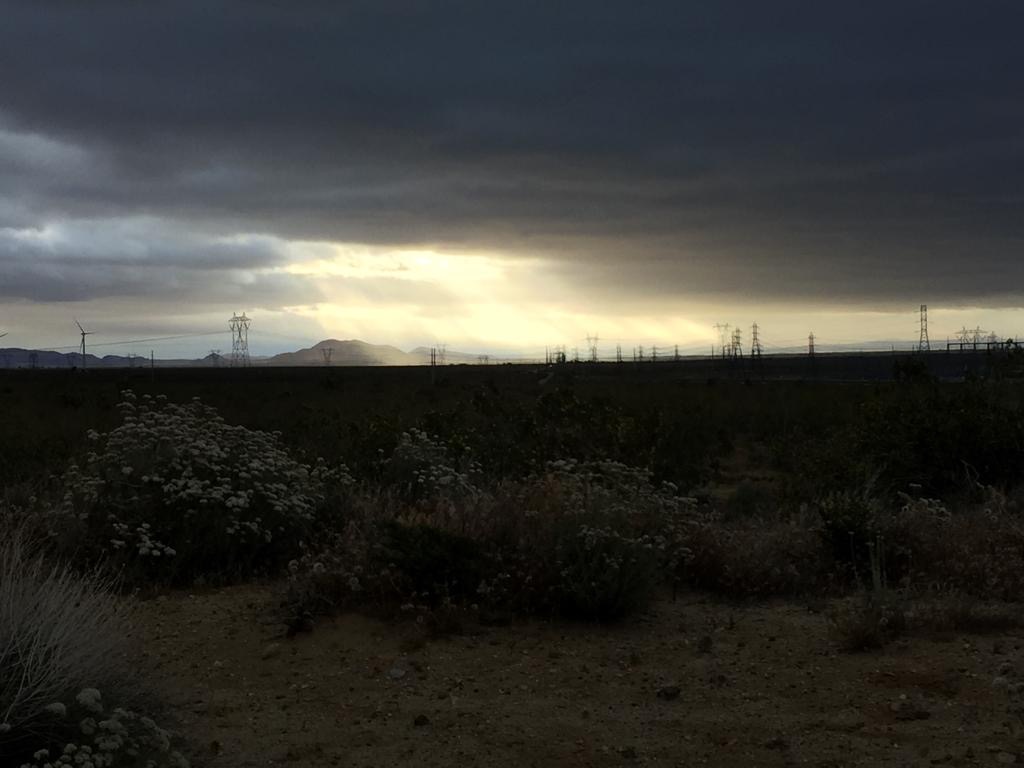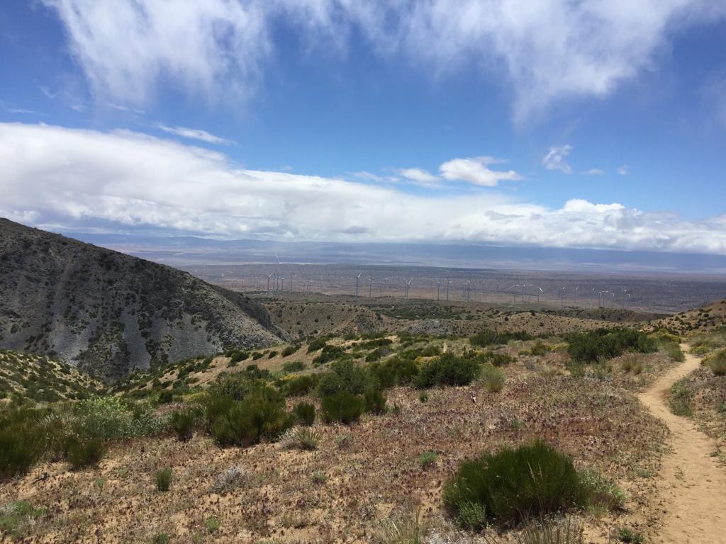 Der Tag hat uns geschlaucht, aber die Sicht auf die Mojave ist super, etwas anderes als alles nur blau. Es kommt nochmals eine Windfarm, wäre nur noch 9 Kilometer, aber es ziehen immer dunklere Wolken auf. Wir haben keine Energie mehr, um nochmals durch eine Windfarm zu laufen, so stellen wir das Zelt. Schluss bei km 886 (Meile 550), gelaufen sind wir 38 km oder 23 Meilen.