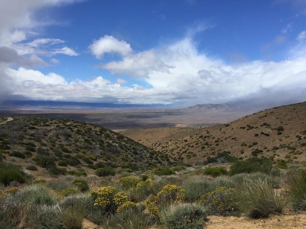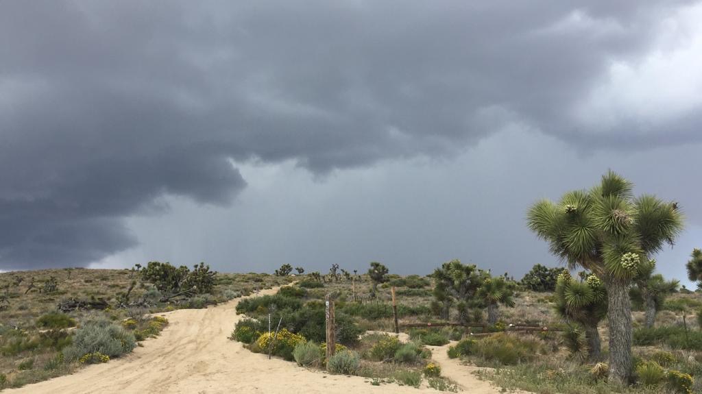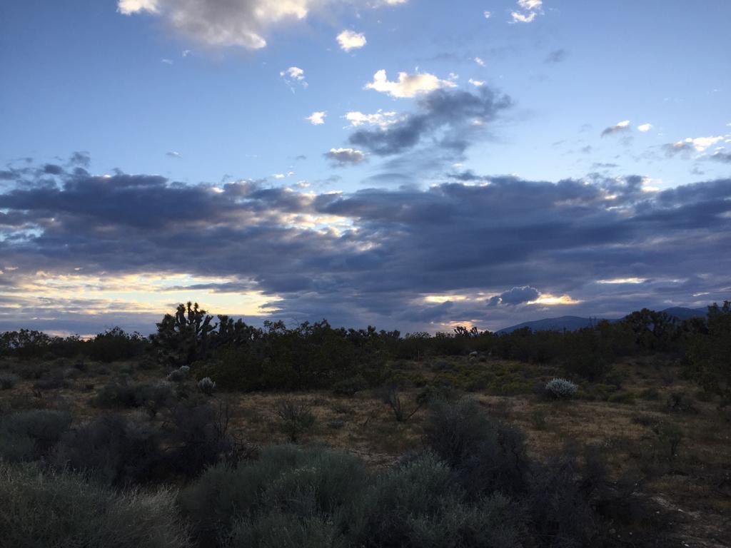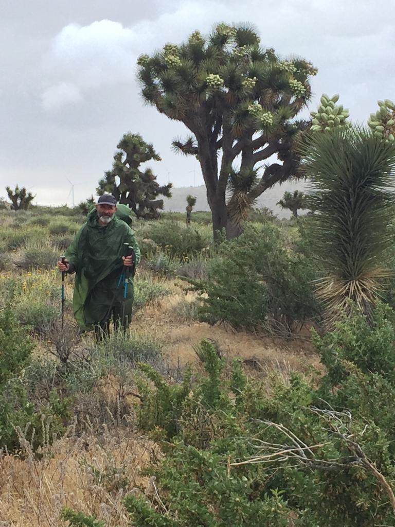 Der Tag hat uns geschlaucht, aber die Sicht auf die Mojave ist super, etwas anderes als alles nur blau. Es kommt nochmals eine Windfarm, wäre nur noch 9 Kilometer, aber es ziehen immer dunklere Wolken auf. Wir haben keine Energie mehr, um nochmals durch eine Windfarm zu laufen, so stellen wir das Zelt. Schluss bei km 886 (Meile 550), gelaufen sind wir 38 km oder 23 Meilen.