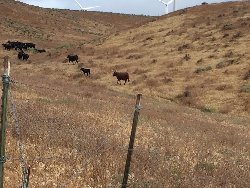 Wir stehen wieder um halb fünf auf, es ist stark bewölkt, aber bis jetzt trocken. Es geht alles geradeaus, 13 Kilometer bis zur Windfarm. Hier leben doch einige Leute, sehr verstreut, meistens in Wohnwagen oder einfachen Hütten. Viele Kühe mit Kälbern auf der Weide, so weit man sehen kann und noch weiter. Der Weidezaun ist überall defekt, darum laufen die Kühe auch auf dem Weg.