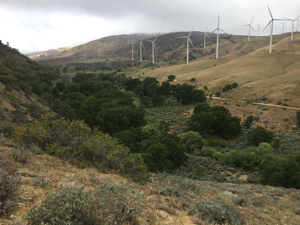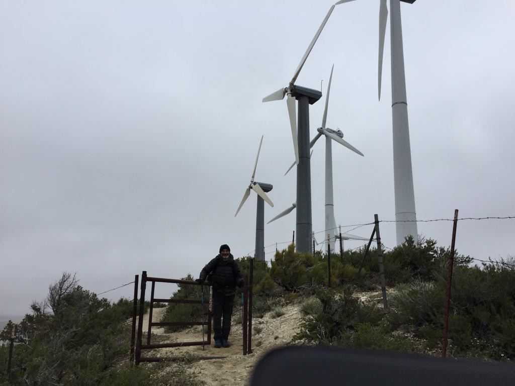 Auch heute windet es wie verrückt und der Weg geht immer oben in der Höhe, unten im Tal wäre es gemütlicher, dort ist aber ein privates Grundstück. Es wäre schon verlockend da hinunterzusteigen, im 2017 ist ein Schweizer hinunter gegangen, aber das ist beim Besitzer des Grundstücks nicht so gut angekommen. In den grossen Windfarmen zu gehen ist nicht so spannend, wir sind sehr froh als es vorbei ist. Bis jetzt haben wir unseren Humor behalten, es wäre aber nicht schlecht, wenn wieder mal die Sonne schiene.