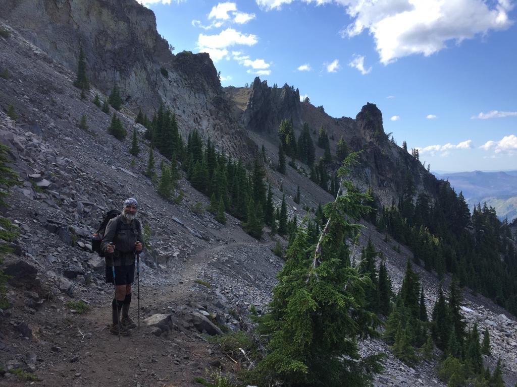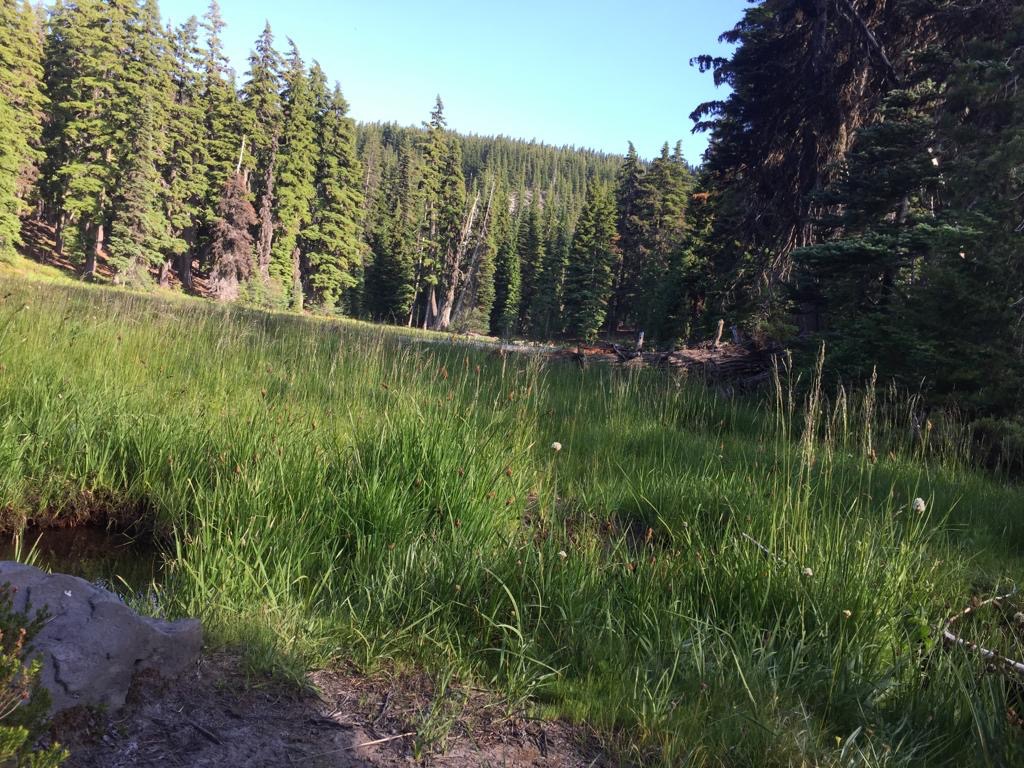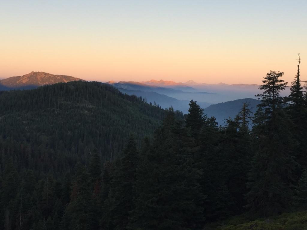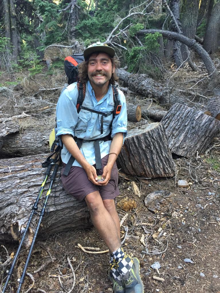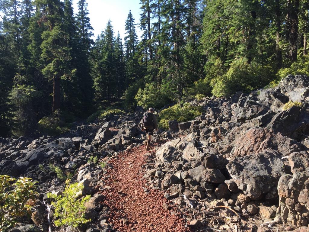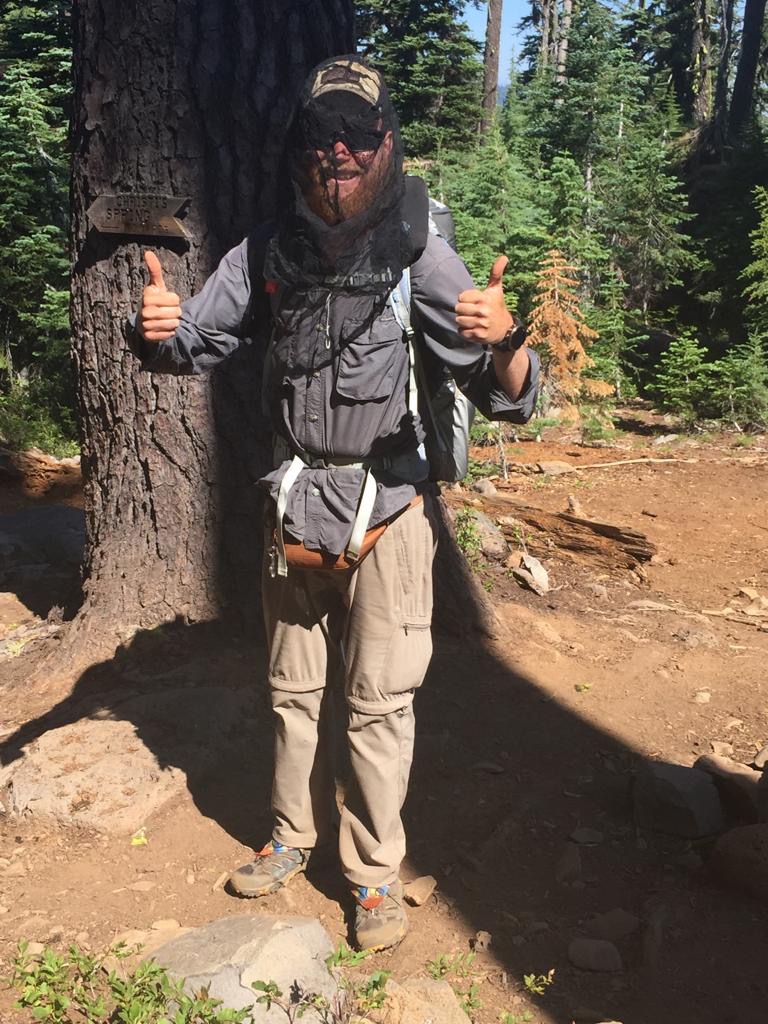 Abmarsch ist jetzt immer vor Sonnenaufgang, und Schluss je nach Wasser. Bei der ersten Pause, die wir machen, kommt Yves (der Schweizer aus Freiburg) singend den Hang hoch: «Trittst im Morgenrot daher…», weiter kommt er nicht, entweder er kennt den Text nicht oder hat keine Puste mehr, eins von beiden wird’s wohl sein. Das letzte Mal haben wir ihn vor der High Sierra gesehen, jetzt sieht er aus wie ein Hiker: längerer Bart und schlanker. Ein Hiker mit bester Laune, super, dafür bekommt er von unserem Knäckebrot, toll, ihn wieder zu sehen. Ist immer wieder schön, Leute zu sehen, die man von der Desert kennt. Yves hat sich mit seinem Netzteil gegen die Mücken gerüstet. Oregon gilt als der Teil vom Trail, in dem am meisten Strecke macht pro Tag, logisch, es bleibt dir gar nichts anderes übrig, wenn du stehen bleibst oder zu langsam läufst, bist du von Hunderten von Mücken umzingelt.