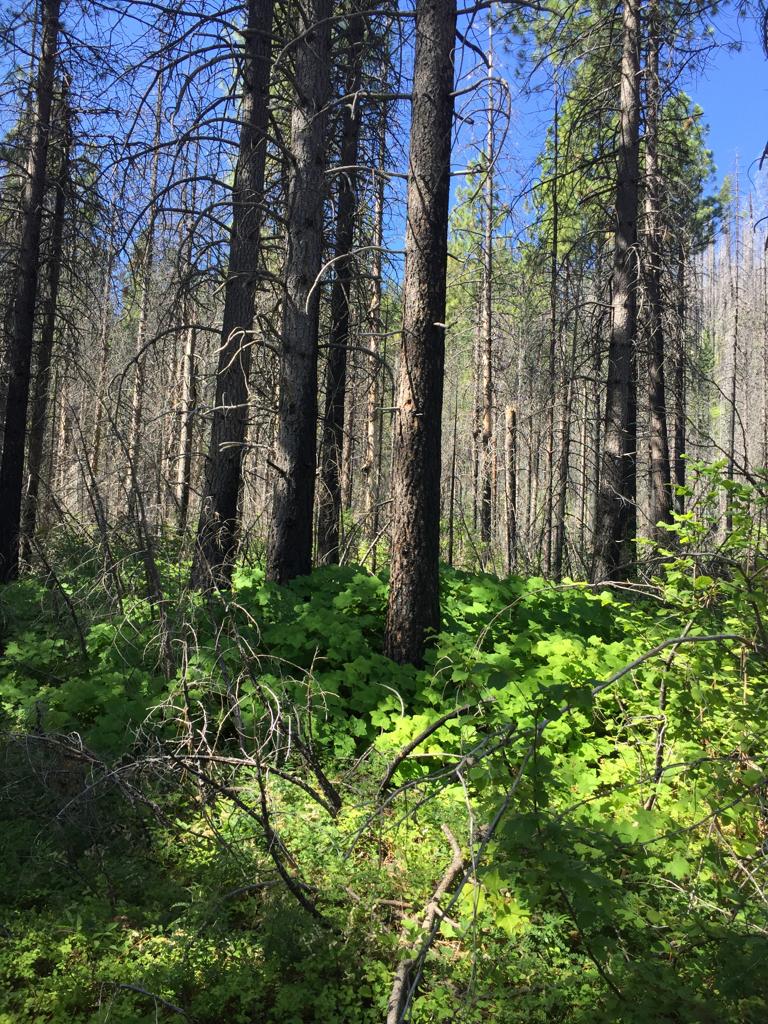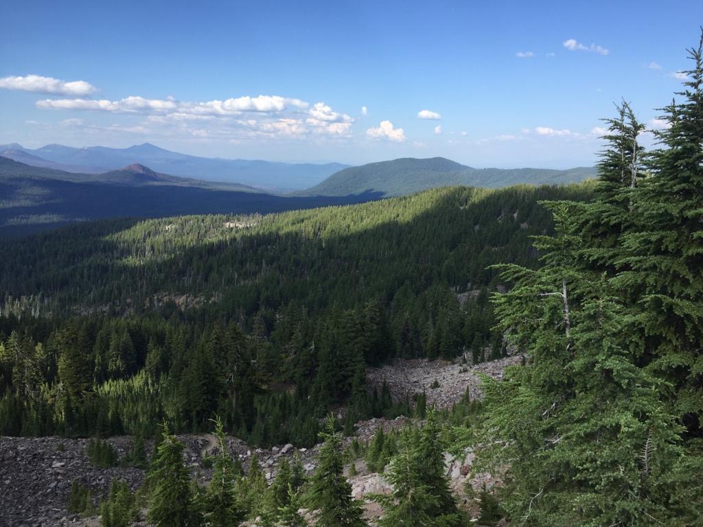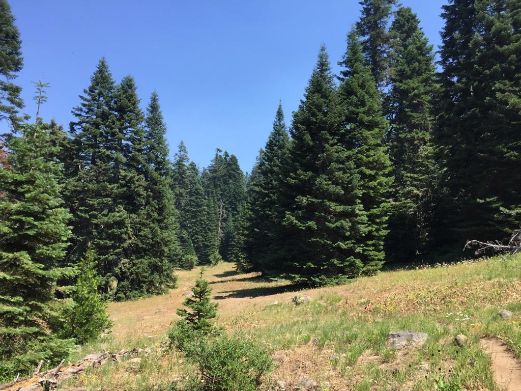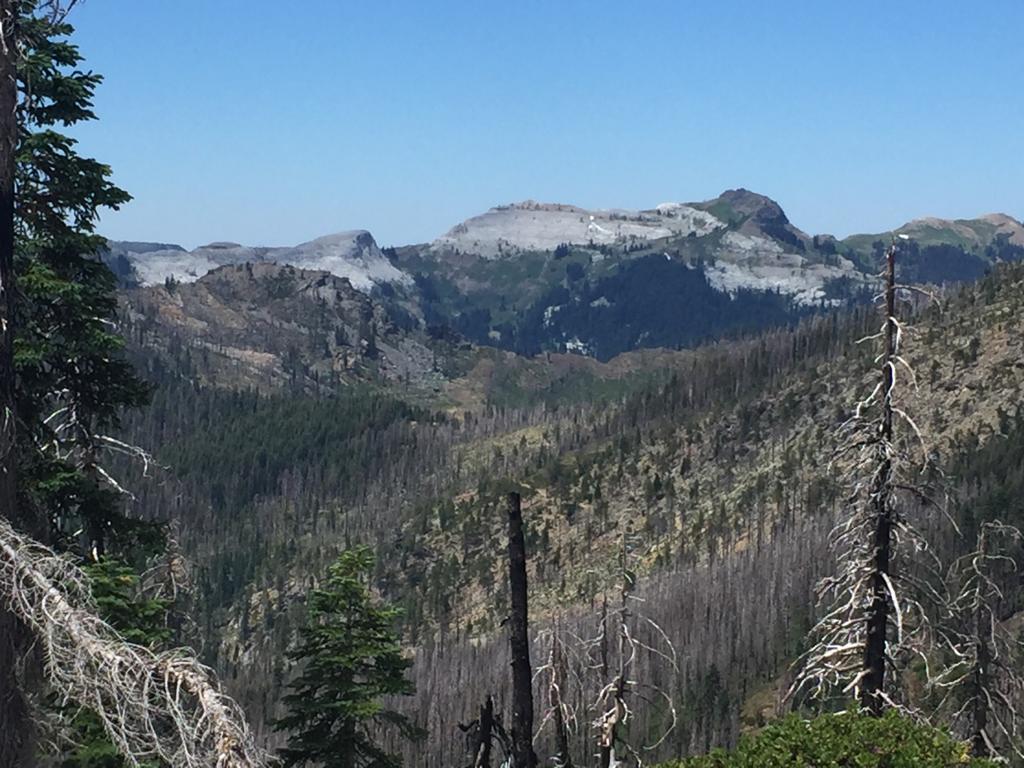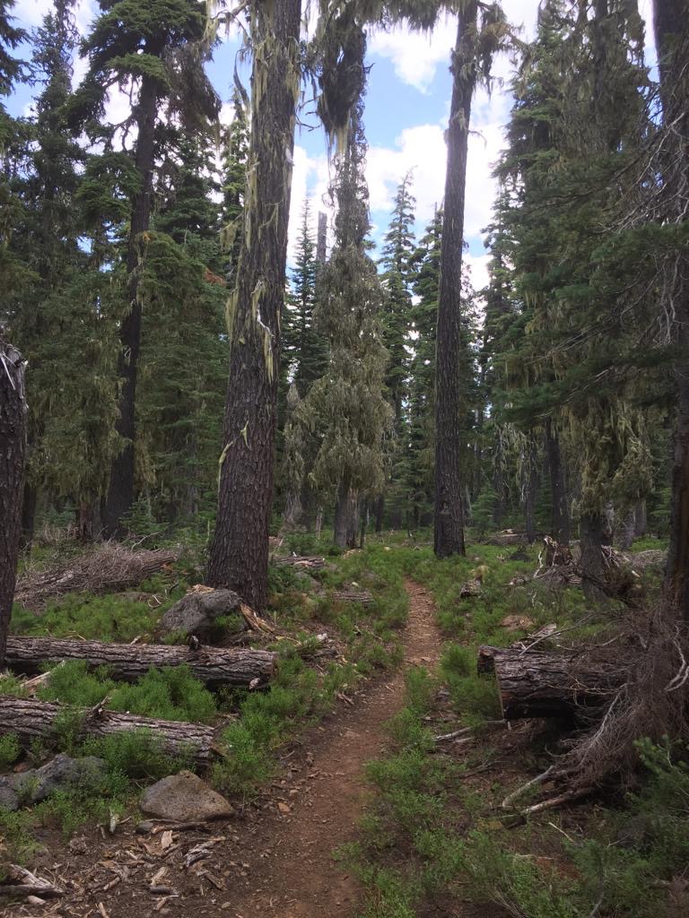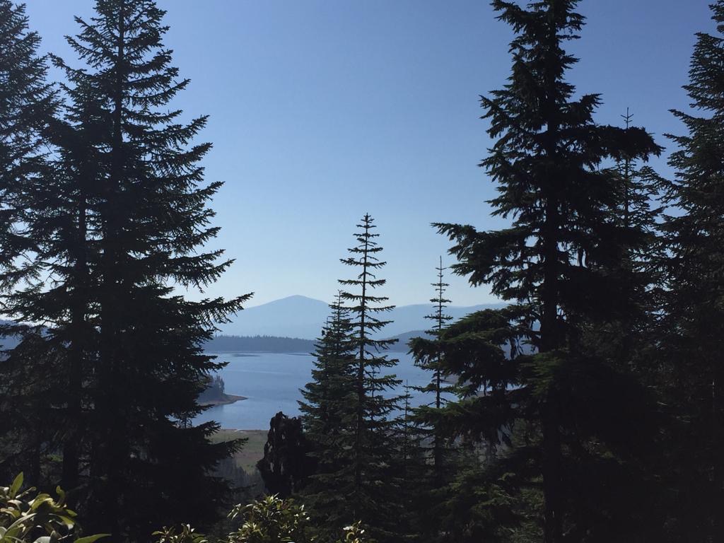 Der Nadelwald, in dem wir laufen, ist ganz sich selbst überlassen, die alten Bäume fallen um oder werden von Insekten oder Schädlingen befallen. Es hat alles, von Jung bis Alt, Gross und Klein, teilweise mit Moos behangen, sieht toll aus. Von oben sehen wir zwischen Tannen hindurch den den Summit Lake.