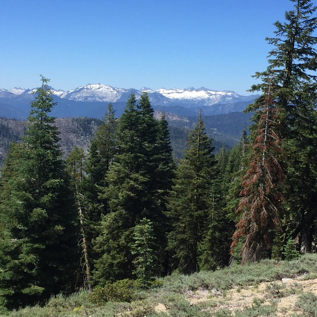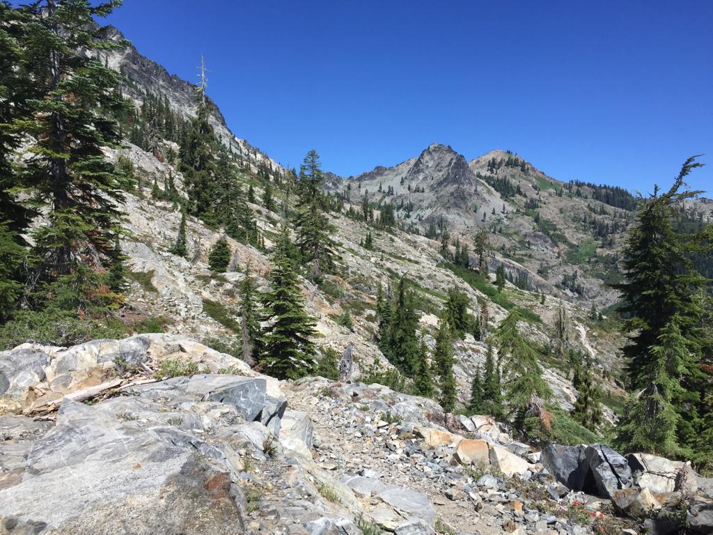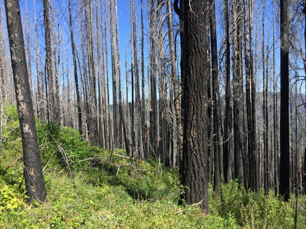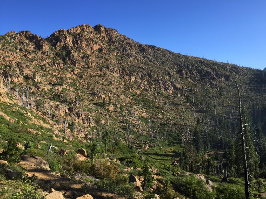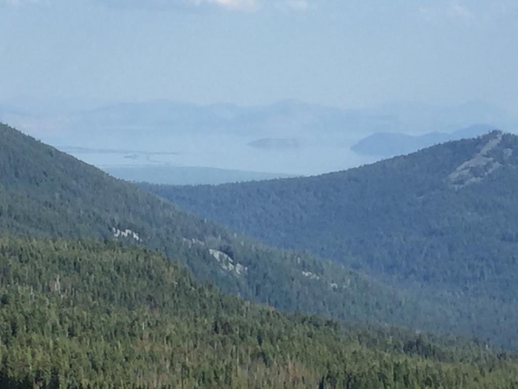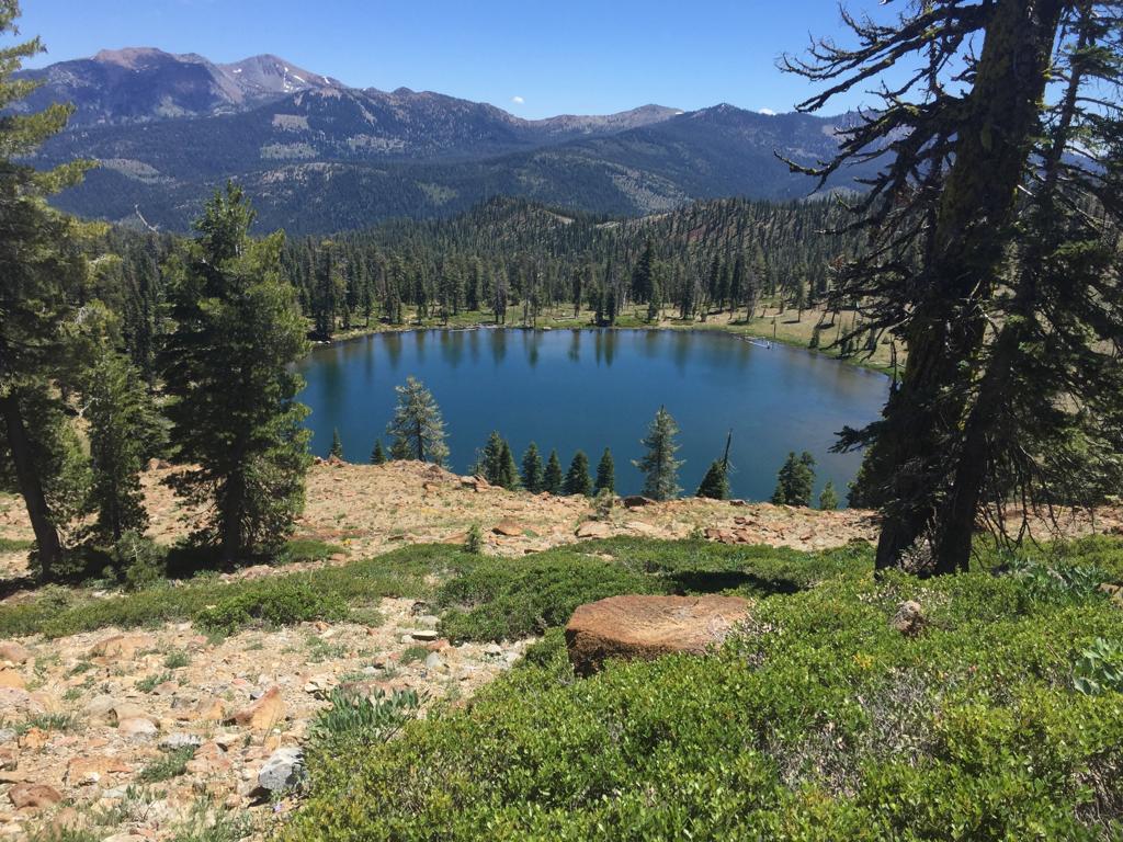 Der Nadelwald, in dem wir laufen, ist ganz sich selbst überlassen, die alten Bäume fallen um oder werden von Insekten oder Schädlingen befallen. Es hat alles, von Jung bis Alt, Gross und Klein, teilweise mit Moos behangen, sieht toll aus. Von oben sehen wir zwischen Tannen hindurch den den Summit Lake.