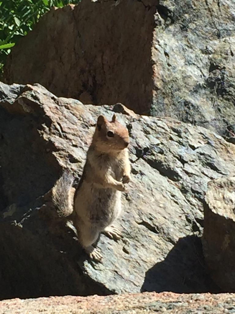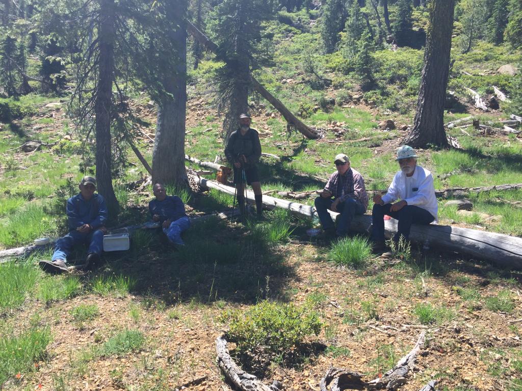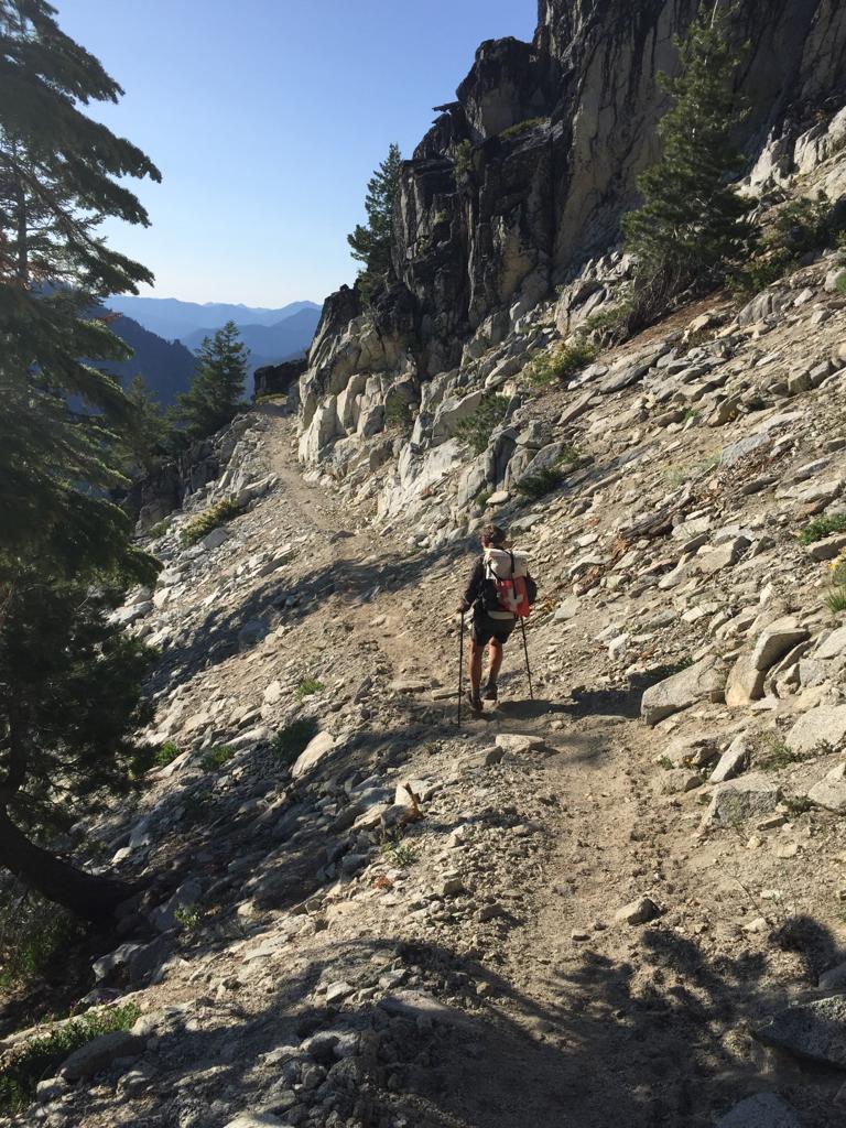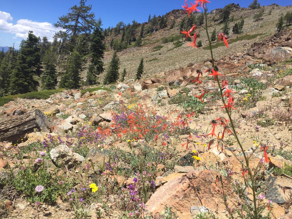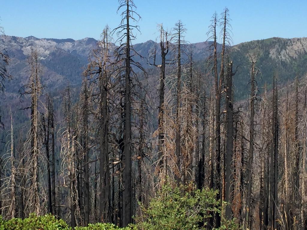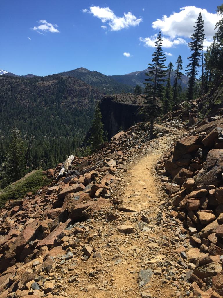 Der Nadelwald, in dem wir laufen, ist ganz sich selbst überlassen, die alten Bäume fallen um oder werden von Insekten oder Schädlingen befallen. Es hat alles, von Jung bis Alt, Gross und Klein, teilweise mit Moos behangen, sieht toll aus. Von oben sehen wir zwischen Tannen hindurch den den Summit Lake.