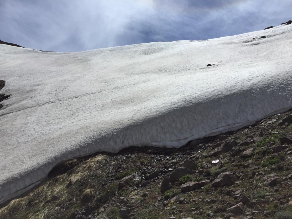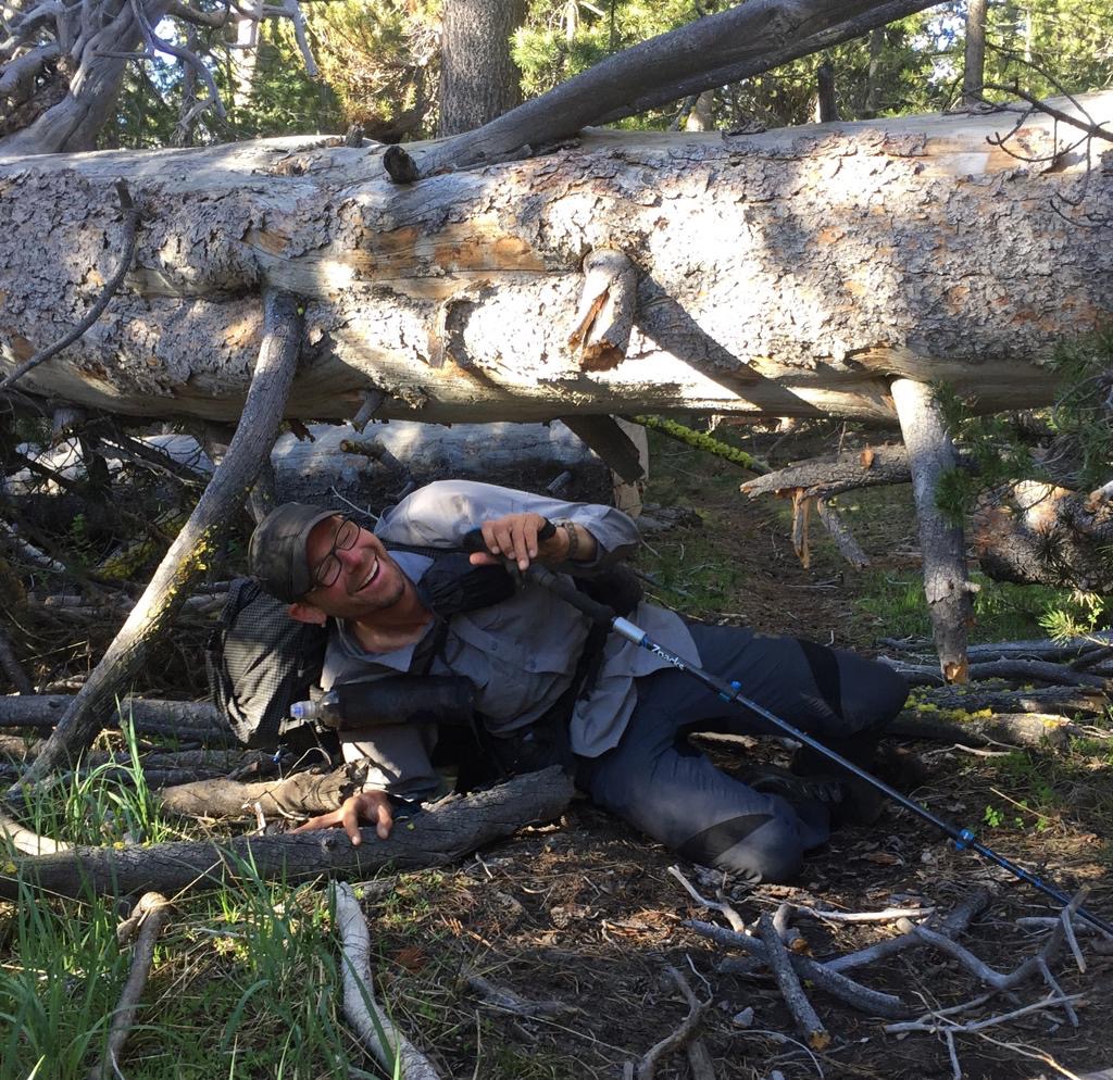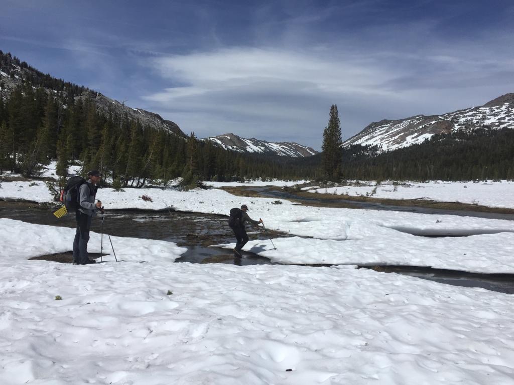 Den Morgen verbringen wir in einem sehr grünen Tal, herrlich dieses Laufen ohne Schnee, so könnte es jetzt tagelang weiter gehen. Markus und Patrizia ziehen vorne weg, Moni und wir beide machen Fotos unterwegs und bleiben mal stehen, um es einfach zu geniessen. Diese Stimmung am kalten Morgen, wenn alles noch leicht gefroren ist und es über dem Wasser leichter Nebel hat, sieht schon toll aus. Wir sehen viele Tiere, Vögel, junge Wiesel und zwei Munggen, einer geht nicht weg, aber berühren würde ich ihn nicht, er guckt böse. Auch ein sehr zutrauliches Deer, ich kann mich ihm bis auf sechs Meter nähern, um es zu fotografieren, dabei stehe ich fast auf eine Schlange, die reagiert ziemlich genervt. Andy und ich sind ganz in unserem Element, ständig sehen wir etwas Interessantes, das kostet Zeit, in der wir laufen sollten. Markus und Patrizia müssen ständig warten, sie sind halt wesentlich schneller und zielstrebiger als wir drei. Wir finden, die kanadische Grenze läuft ja nicht weg, hingegen weisst du nie, ob du wieder solche Momente hast.