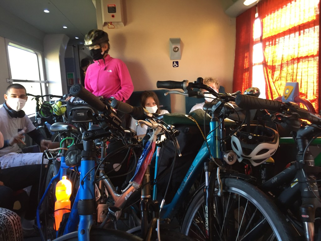 Ihm Ausland ist unsere Devise nicht zu trödeln beim Einsteigen meisten sind die Züge voll besetzt. Also waren wir recht energisch beim Einsteigen, wir konnten unsere Velos aufhängen und die Gepäcktaschen zum Sitzplatz nehmen. Danach wurde es immer enger am Schluss waren etwa 15 Fahrräder in diesem kleinen Abteil und natürlich die Velofahrer dazu.