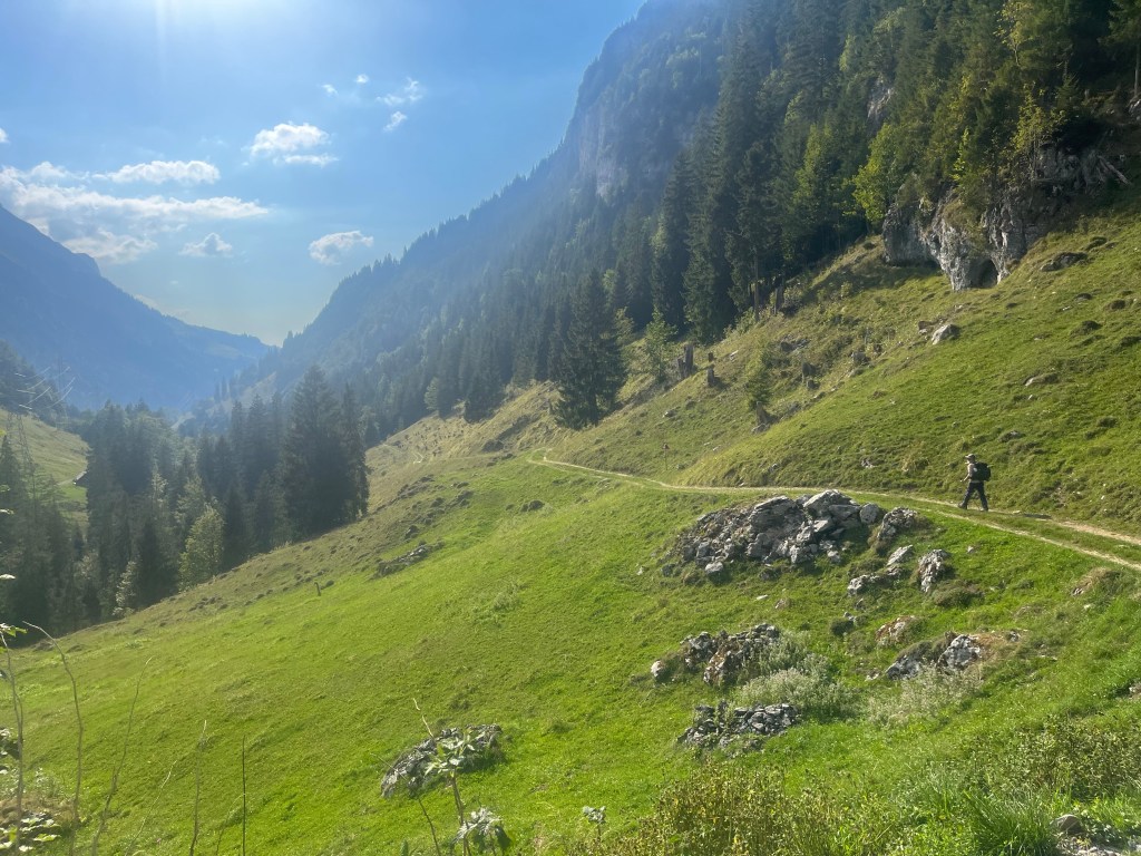 Danach führte der Weg über Wiesen und Alpweiden bei extrem heissen Wetter. Den ganzen Tag brannte die Sonne bei über 30 Grad auf uns nieder.
