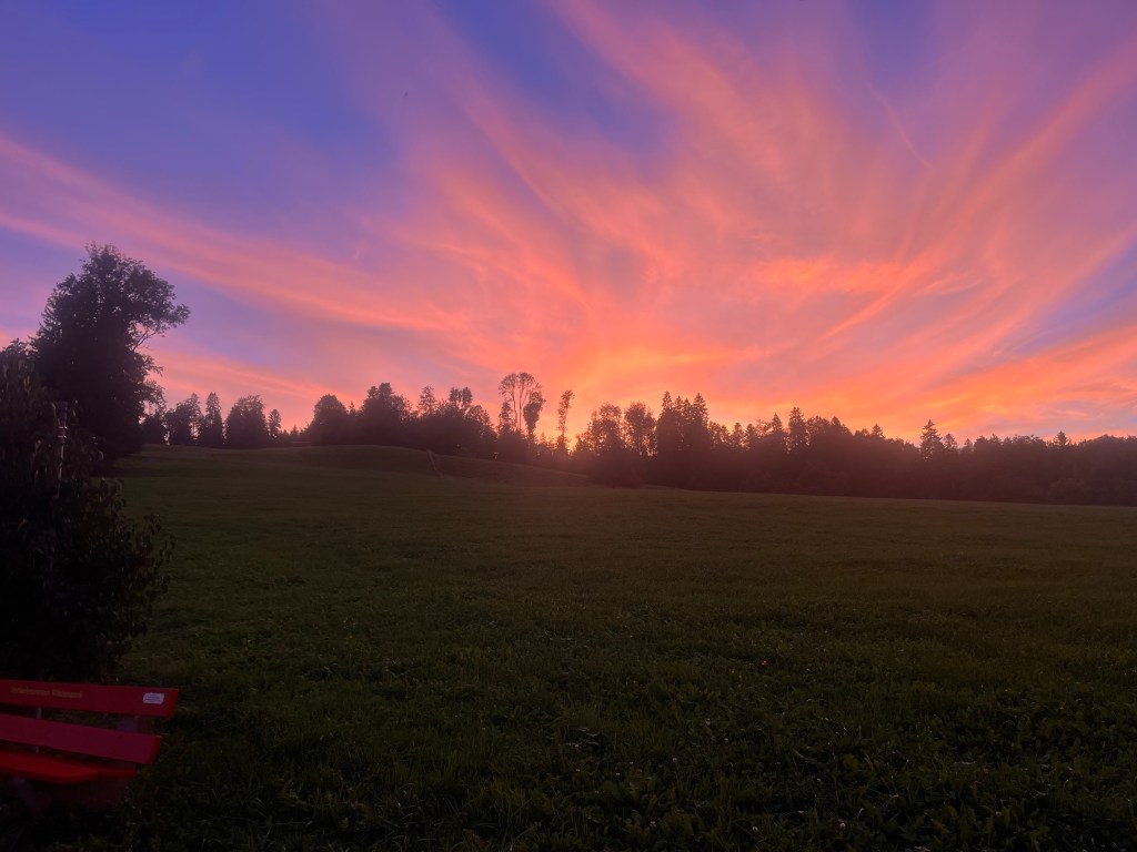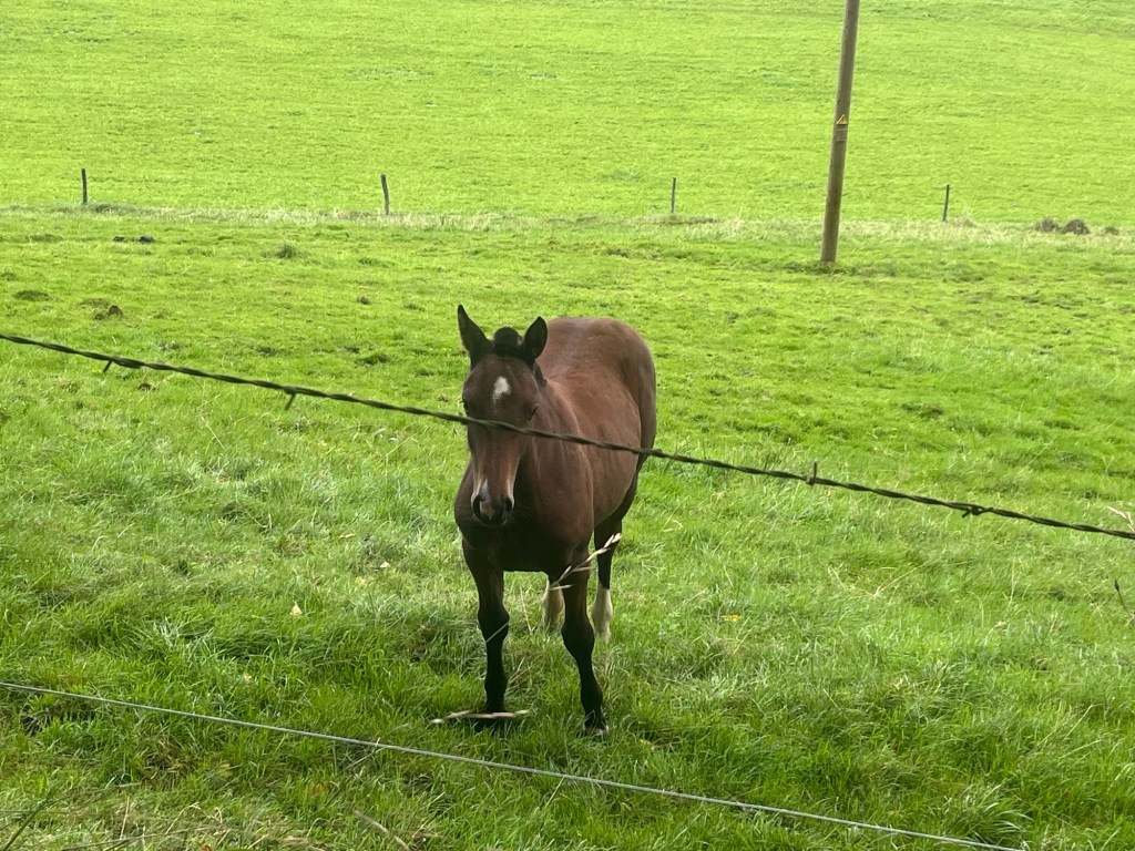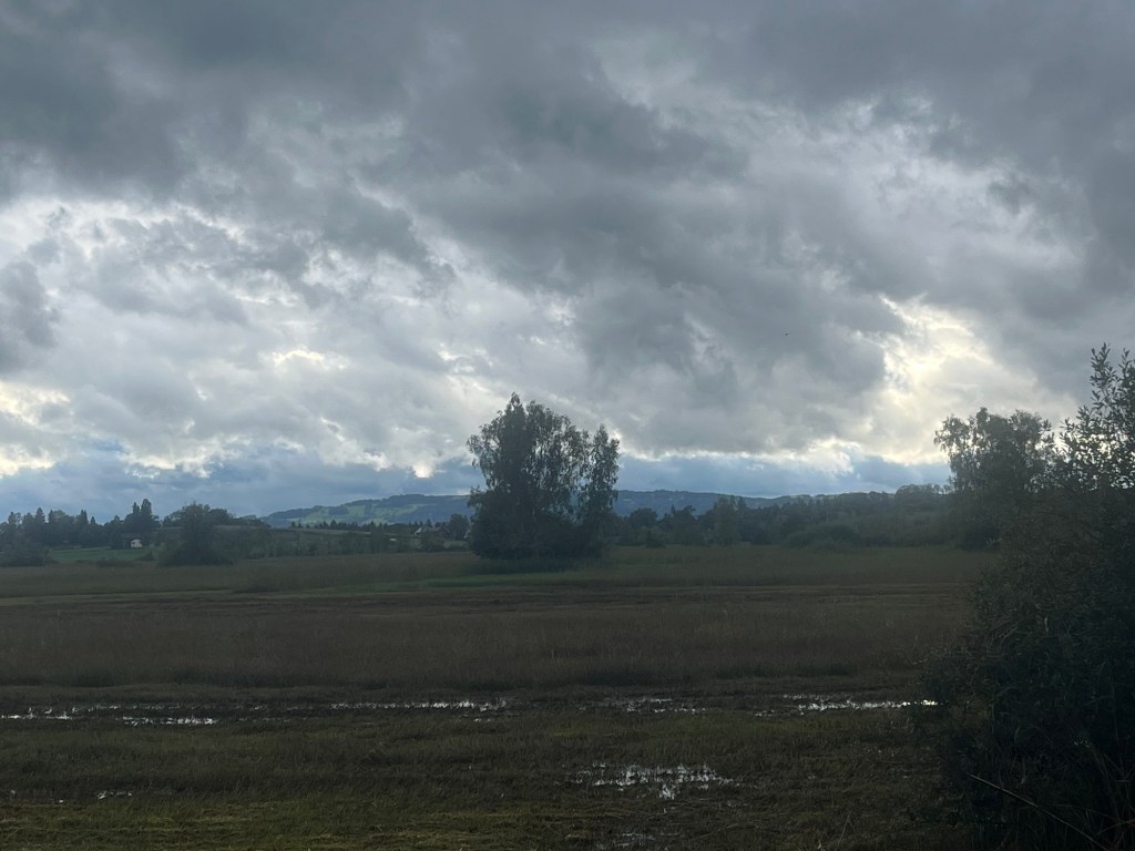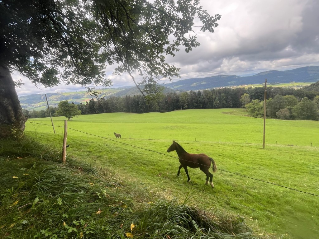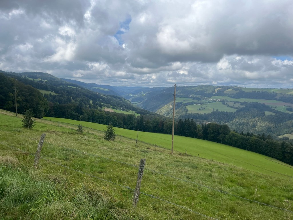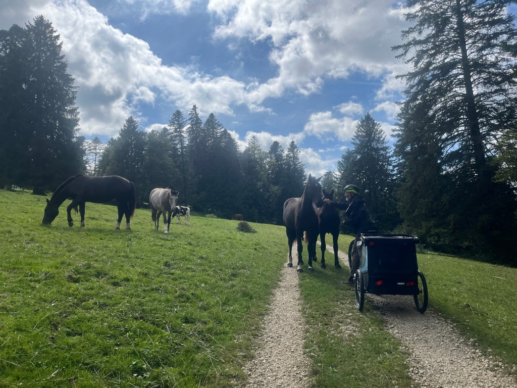 Diese Jura Hochebenen sind sehr schön. Überall Pferde mit ihren Jungen auf den riesigen Weiden, teilweise mit einzelnen Tannen bespickt und wir fahren mittendurch.