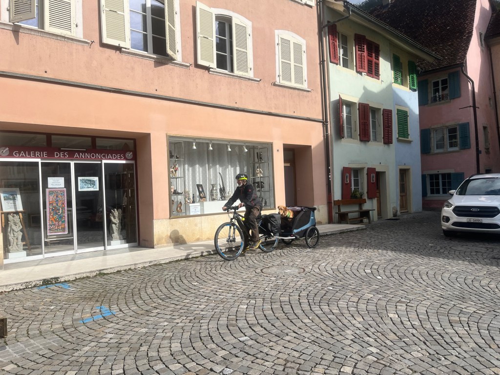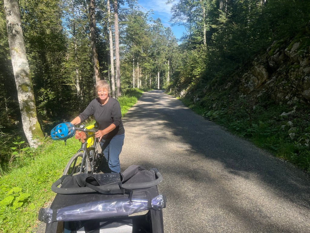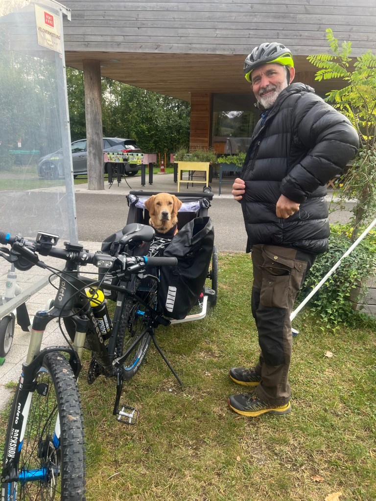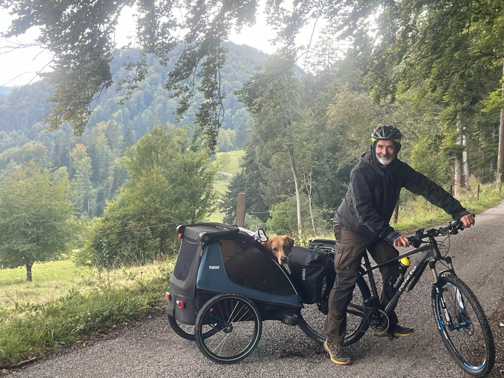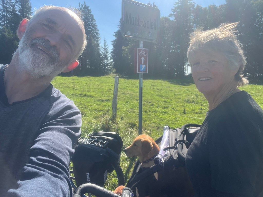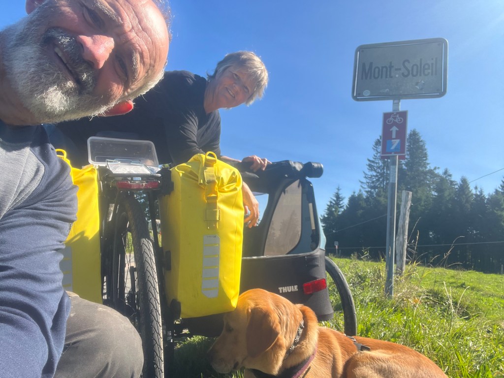 Hoch geht’s zu Mont Solei auf 1248 müM und wir schieben das Velo und Leeroy springt nebenher.