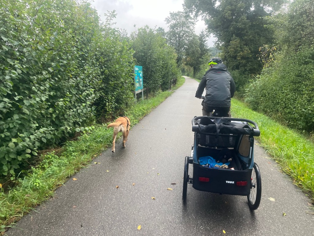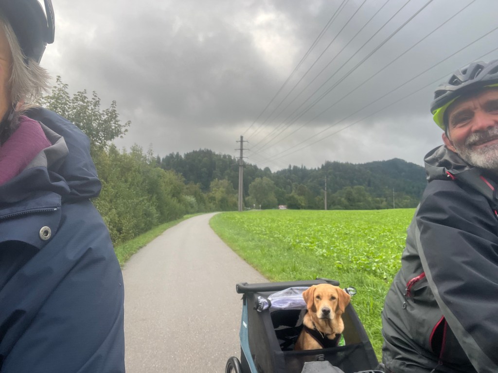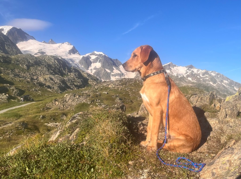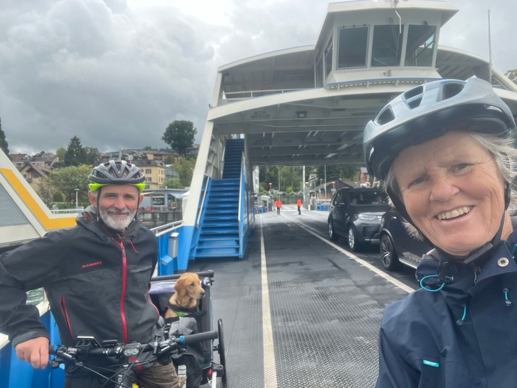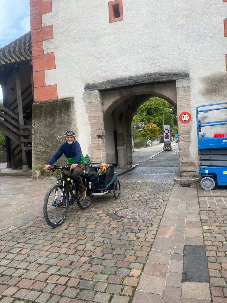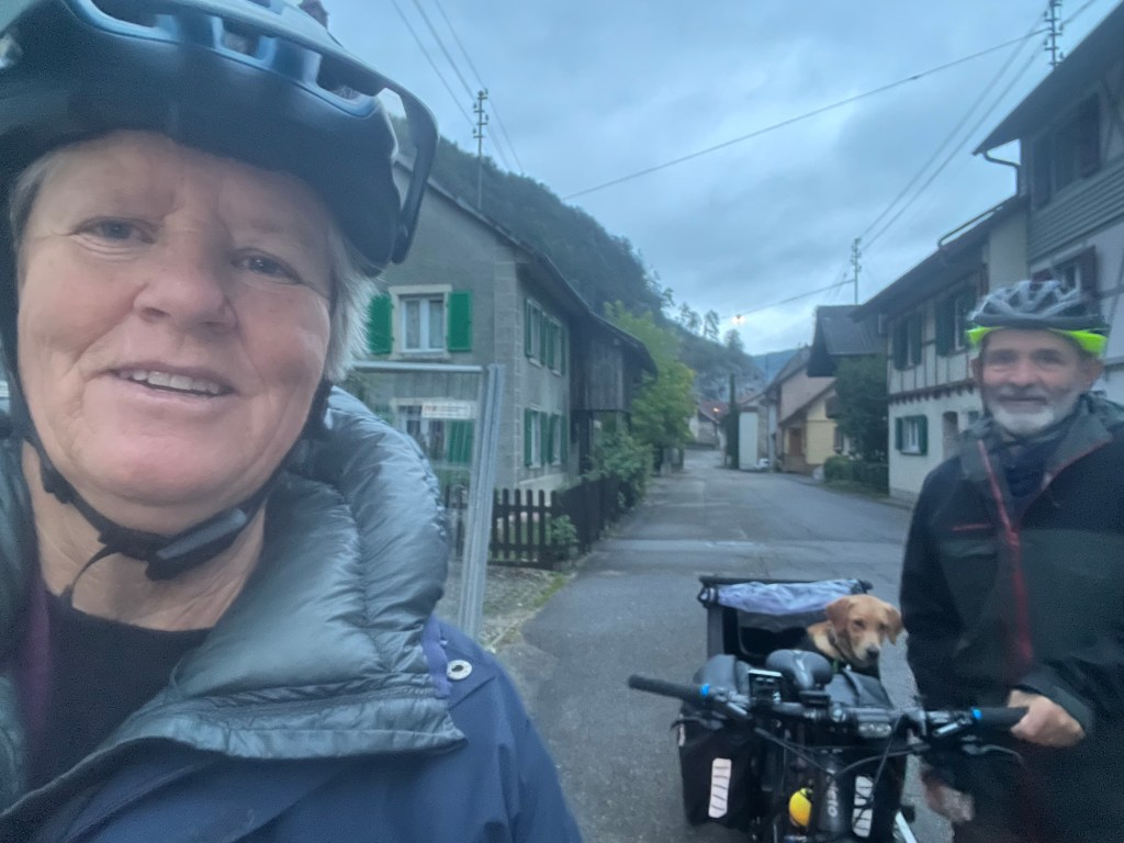 Hoch geht’s zu Mont Solei auf 1248 müM und wir schieben das Velo und Leeroy springt nebenher.