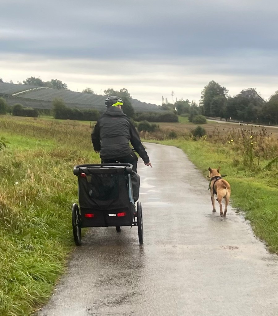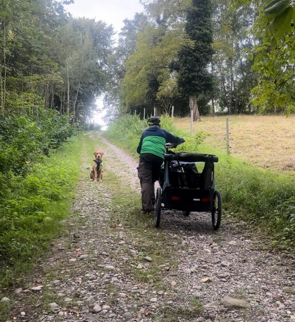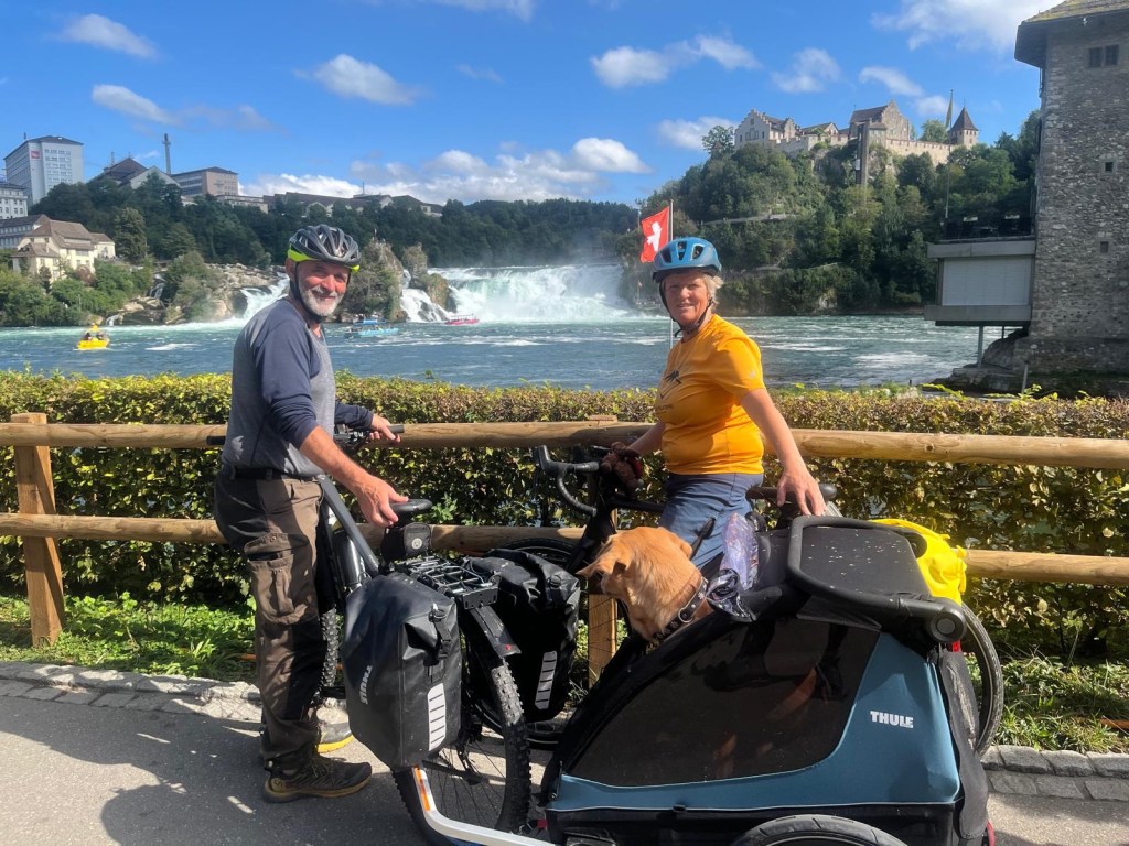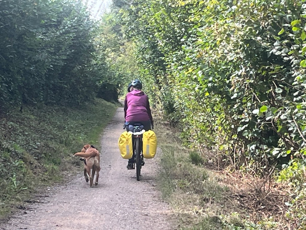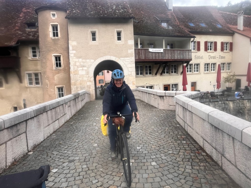 Hoch geht’s zu Mont Solei auf 1248 müM und wir schieben das Velo und Leeroy springt nebenher.