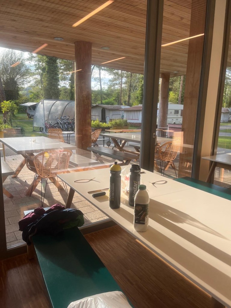 Wir schlafen bis um halb acht Uhr und die Sonne scheint endlich . Der Campingplatz liegt im Wald und somit ist es noch relativ frisch.