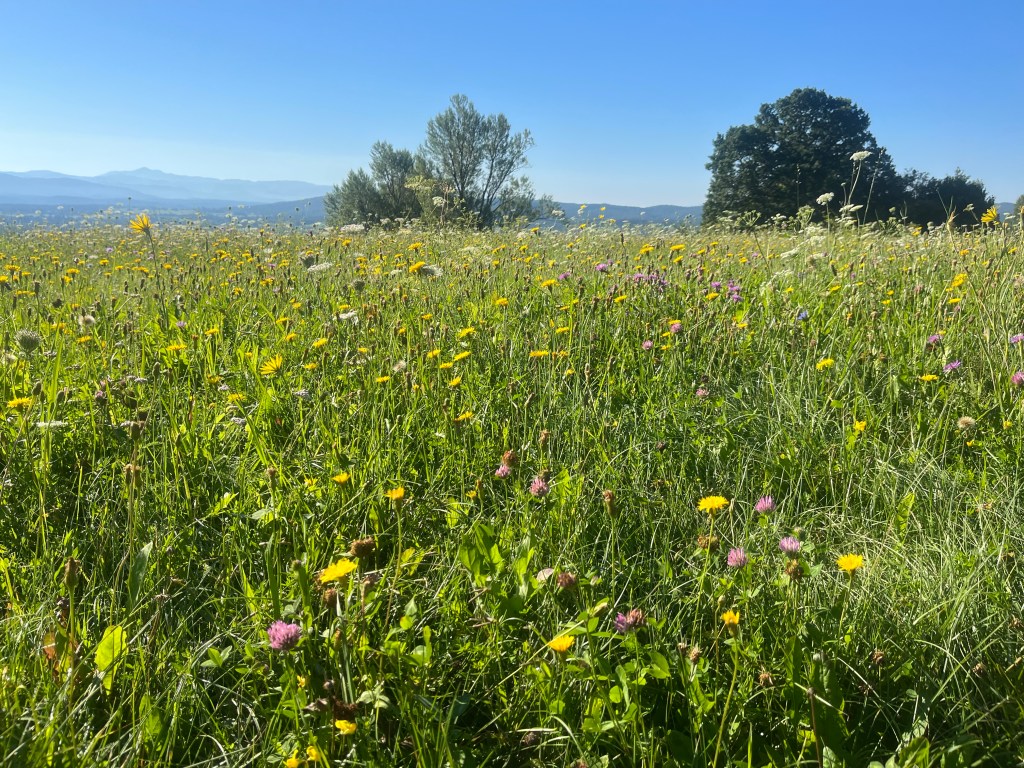 Bis zum Höhlenschloss von Predjama liefen wir zwischen wunderschönen Blumenwiesen durch.